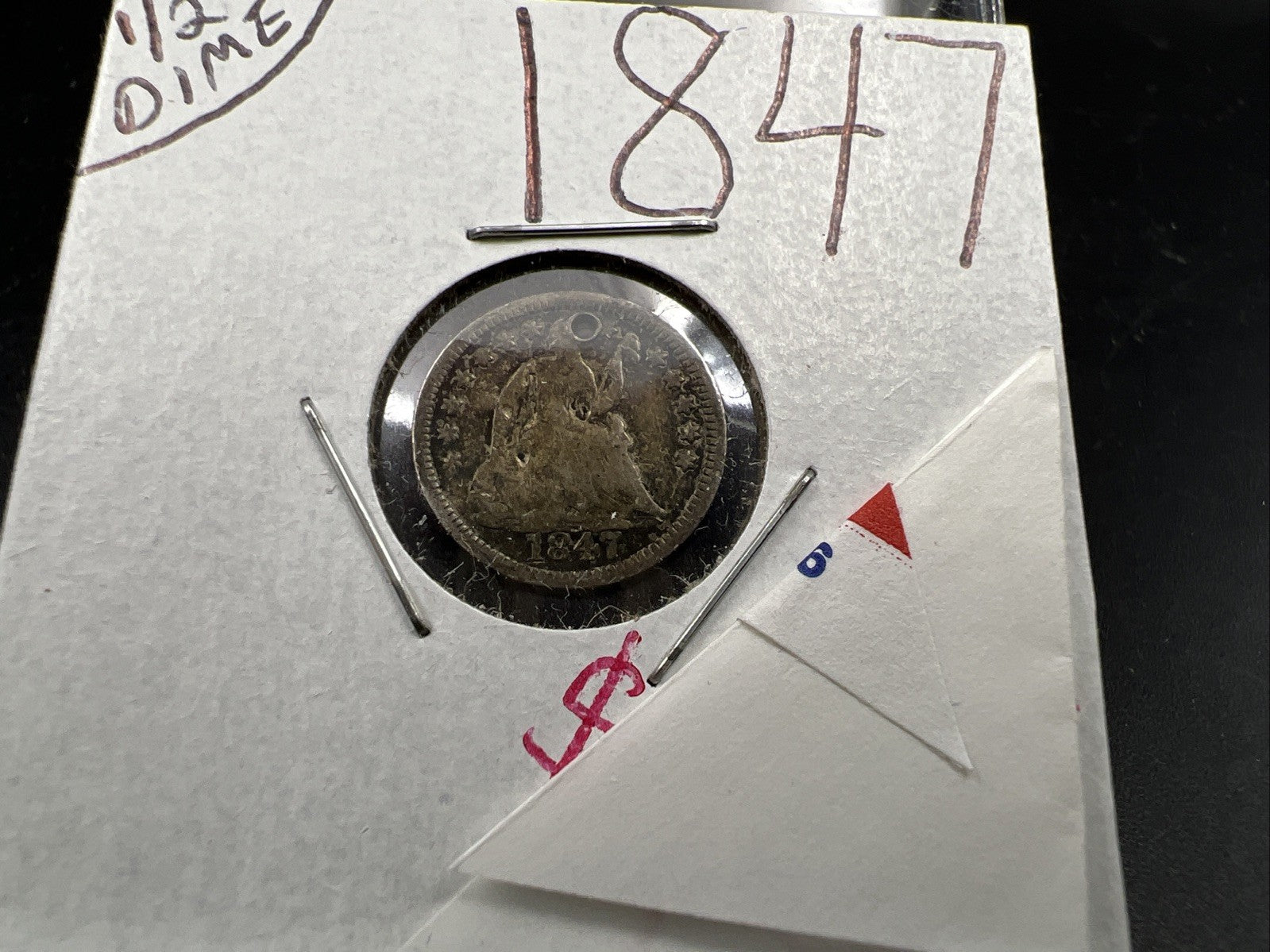 1847 5c Liberty Seated Half Dime Coin VG / F Details Damaged Holed Bent ED