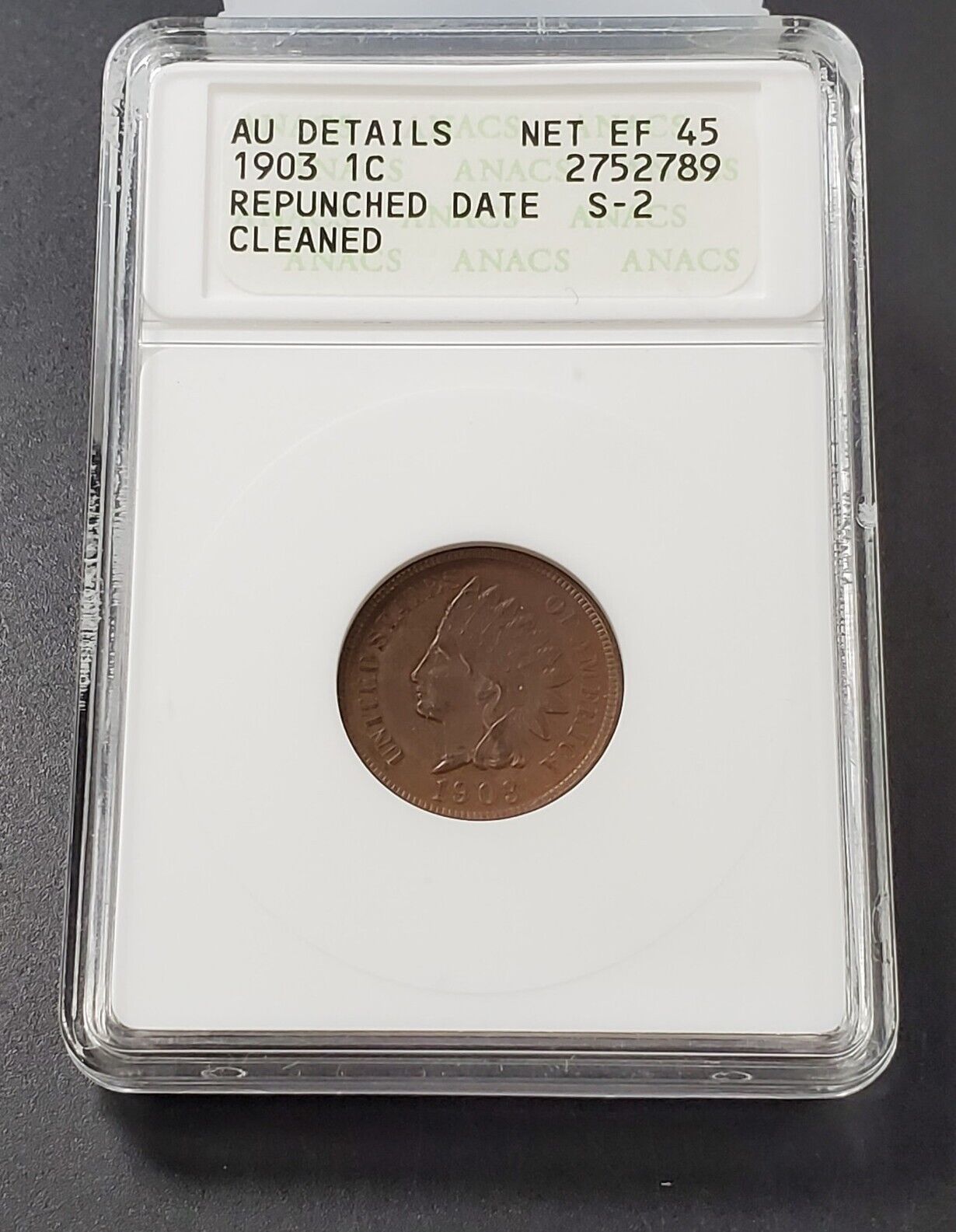 1903 Indian Head Cent Variety Error Coin ANACS EF45 Repunched Date S-2 Cleaned