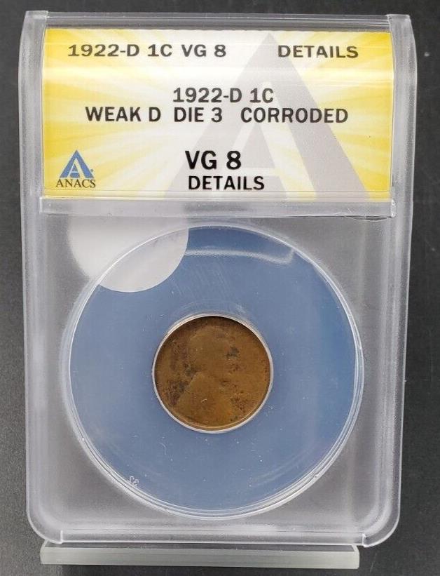1922 D 1c Lincoln Wheat Cent Penny Coin ANACS VG8 Details Weak Die 3 Corroded