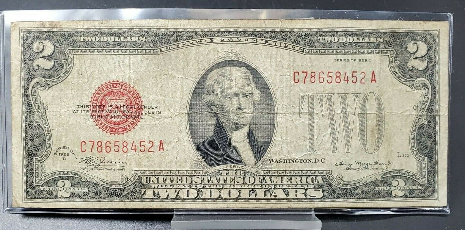 1928 $2 D Legal Tender Note Bill Red Seal United States Currency GOOD Macroplate