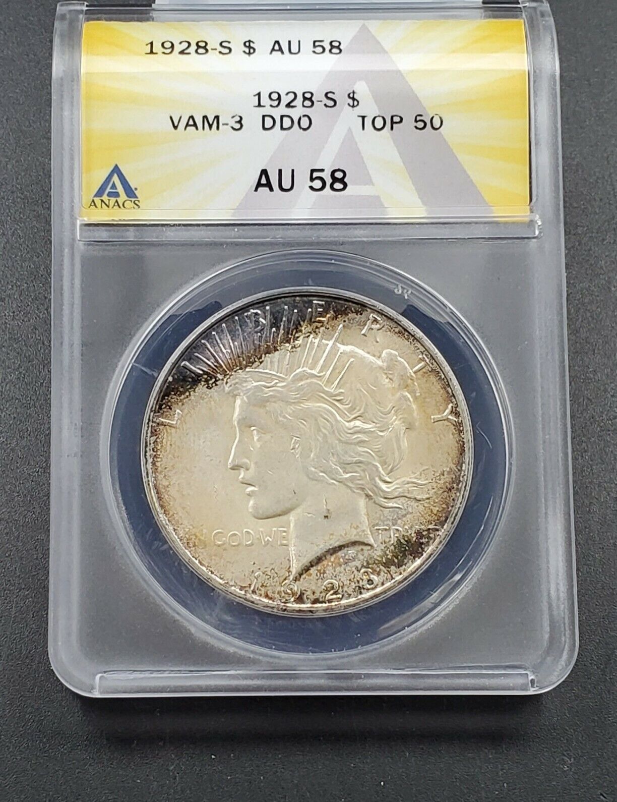 1928 S Peace Dollar Variety ANACS AU58 DDO VAM-3 DBL Toner