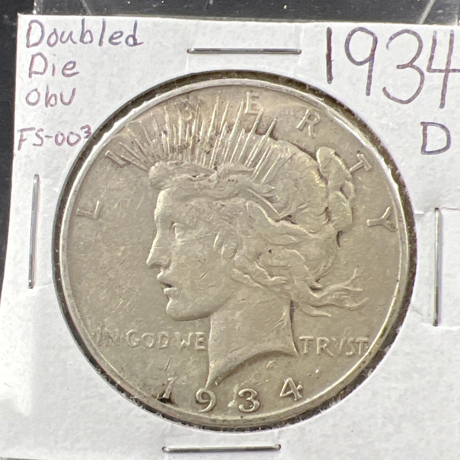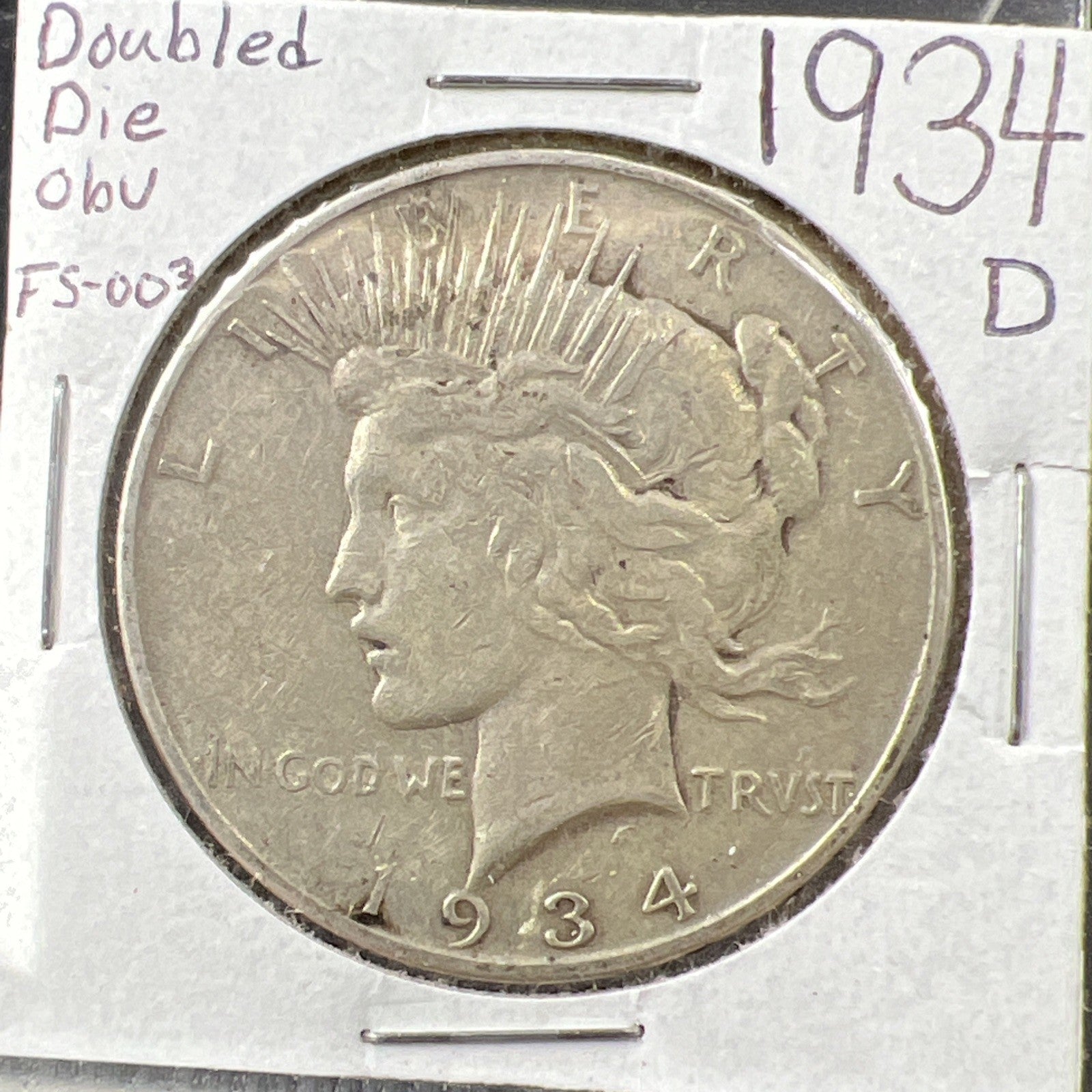1934 D $1 Peace Silver Dollar Coin VAM 3 FS-003 Double Die OBV Medium D VF Circ