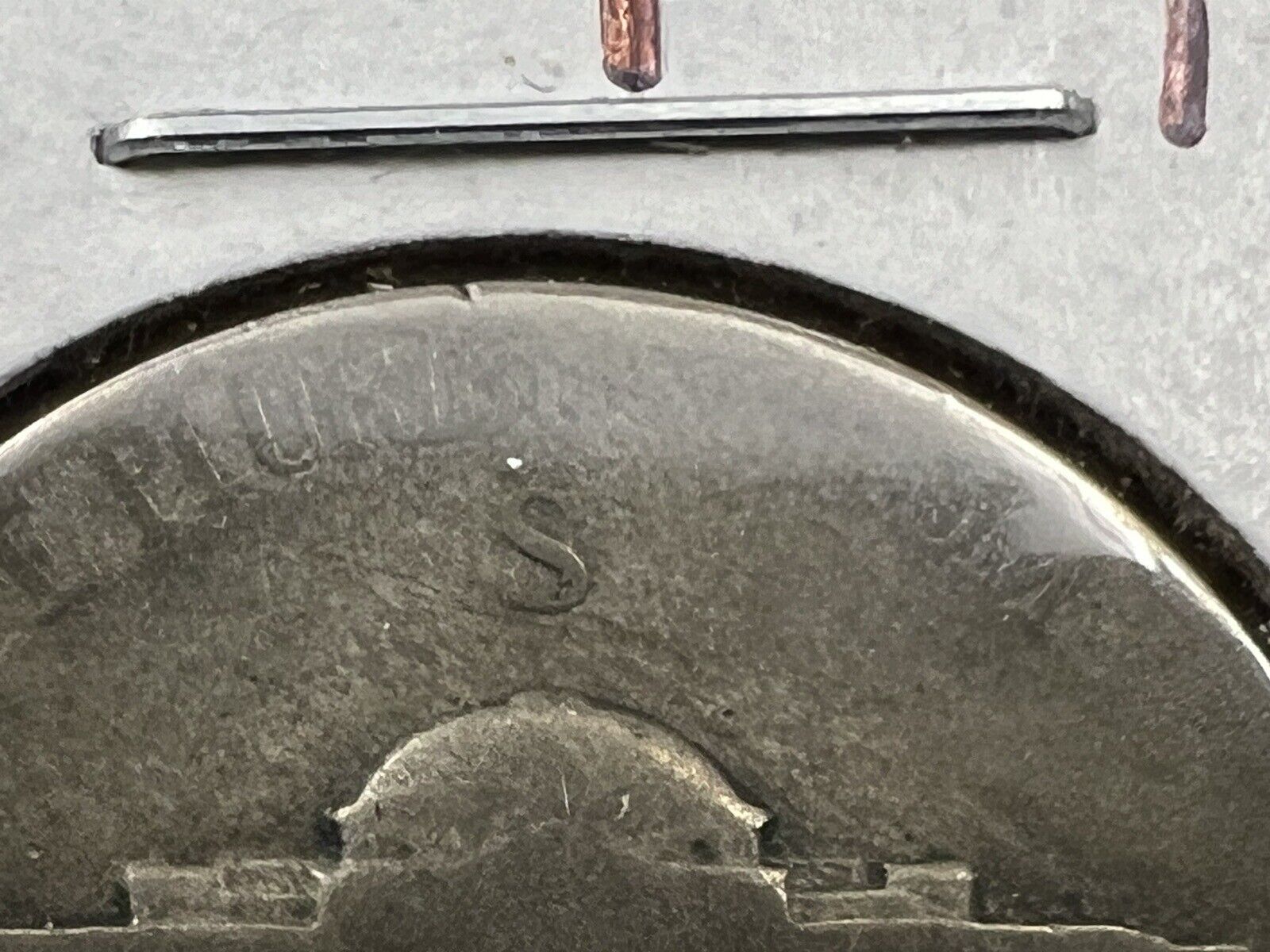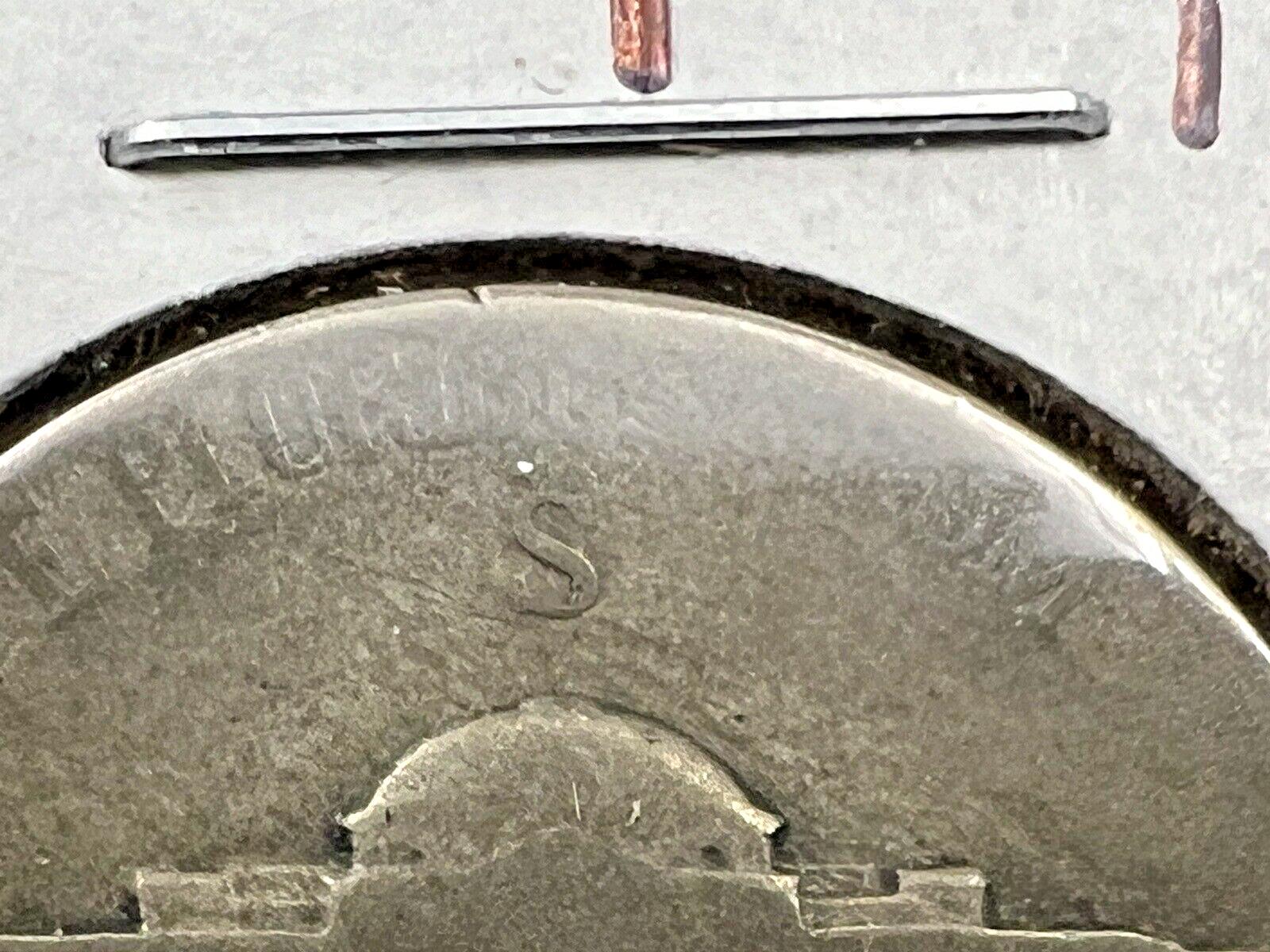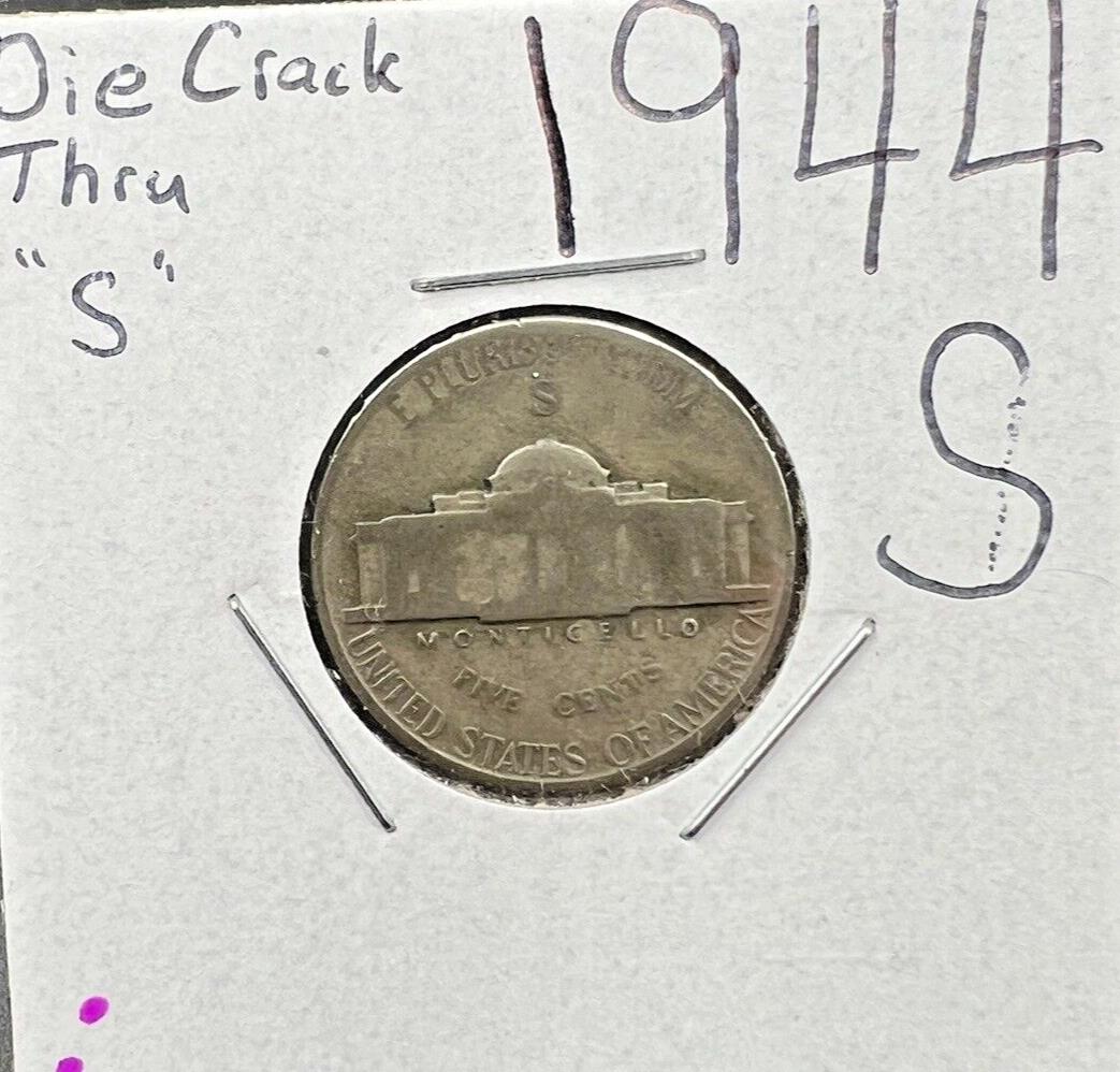 1944 S 5c WW2 Jefferson 35% Silver Nickel Coin Die Crack through S Circ Variety