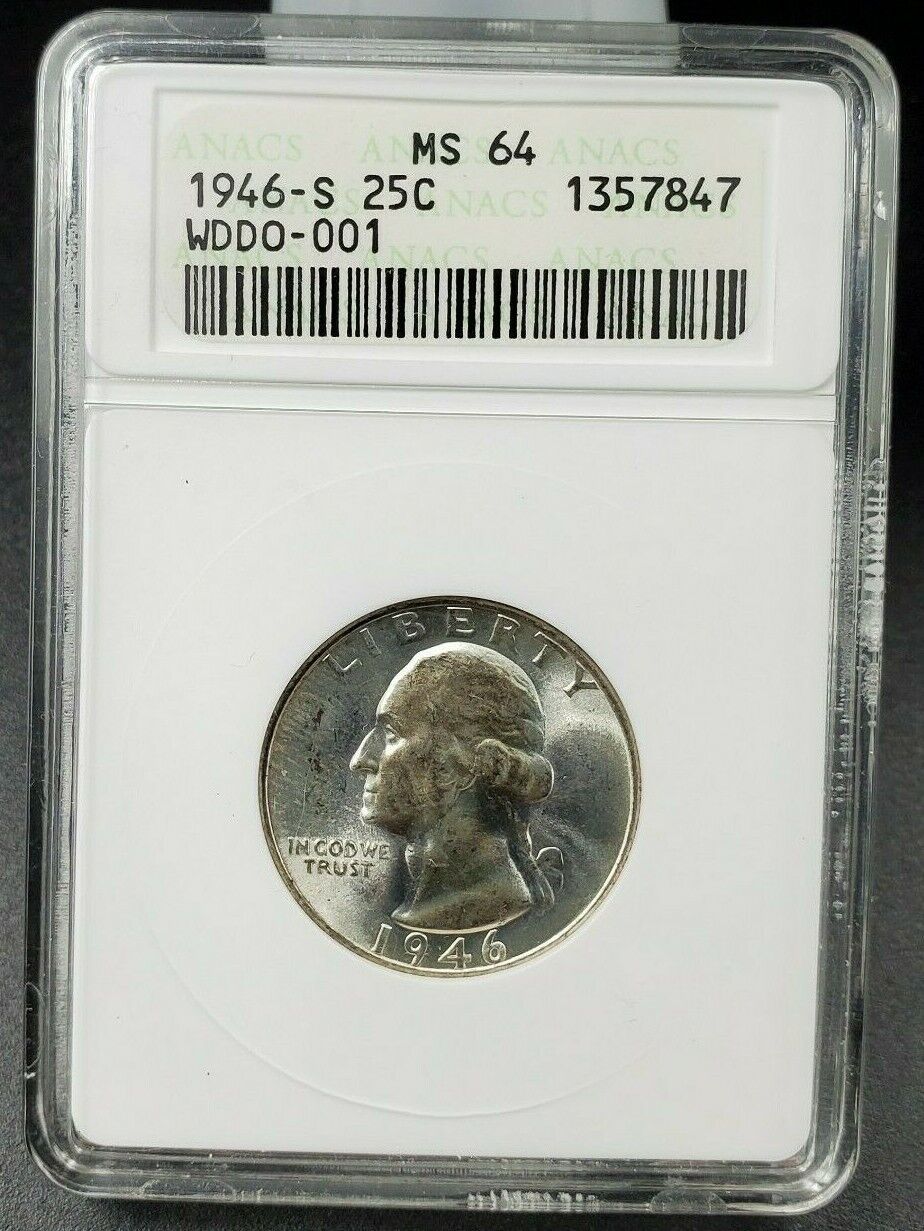 1946 S Washington Quarter Variety Coin ANACS MS64 DDO-001 DMR-002 Double Die OBV