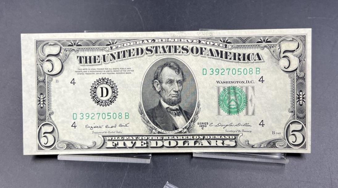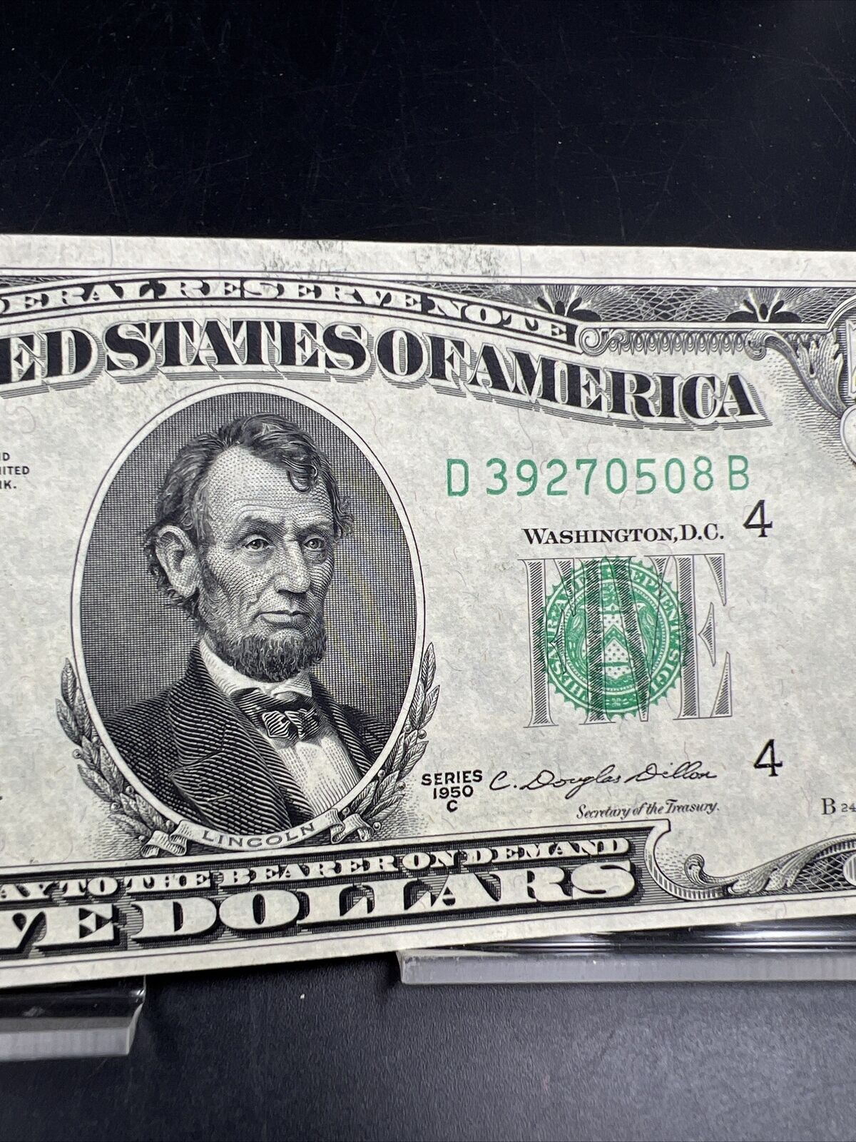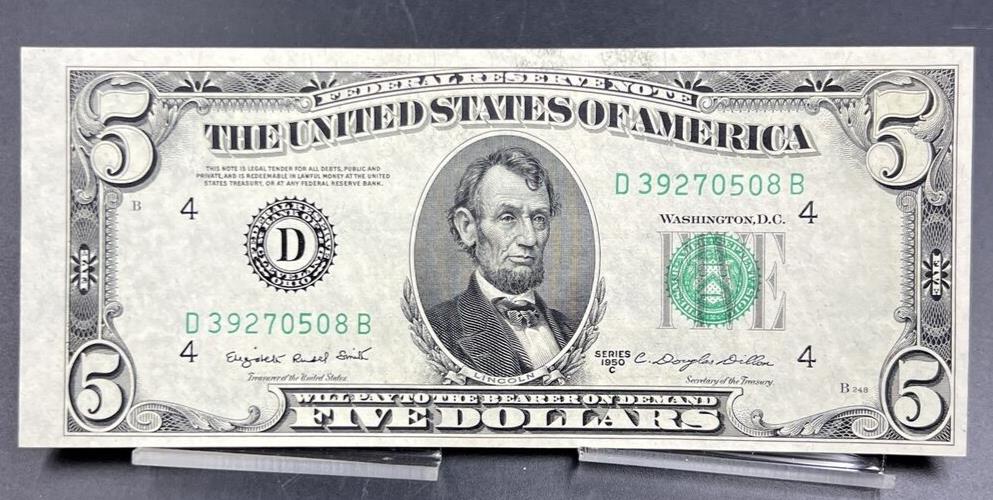 1950 C $5 Five Dollar FRN Federal Reserve Note Bill CU UNC Slight Off Center #08