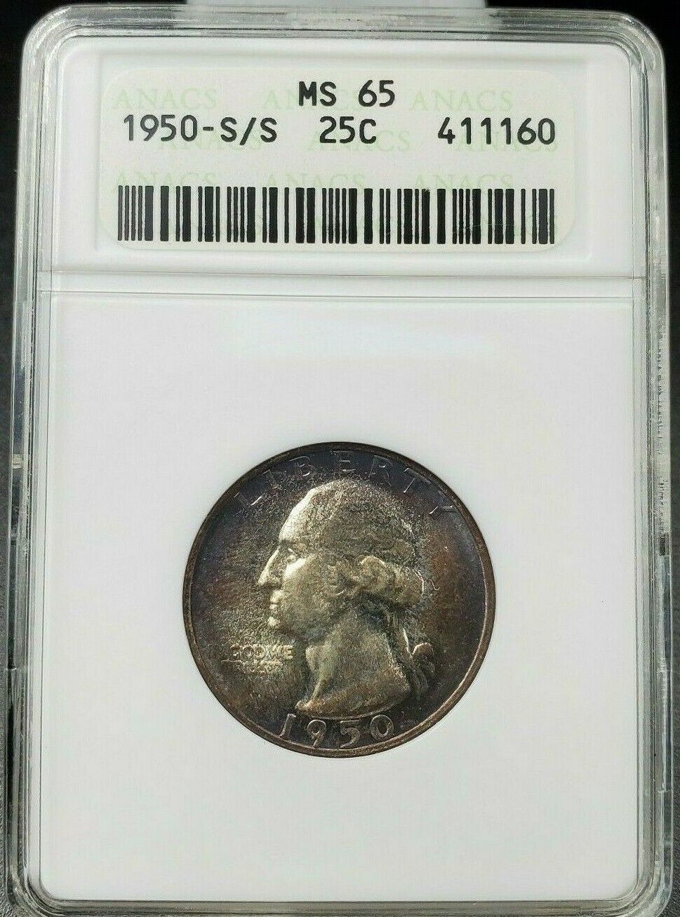 1950 S S/S 25c Washington Quarter Coin Variety MS65 FS-501 ANACS PQ Toning Toner
