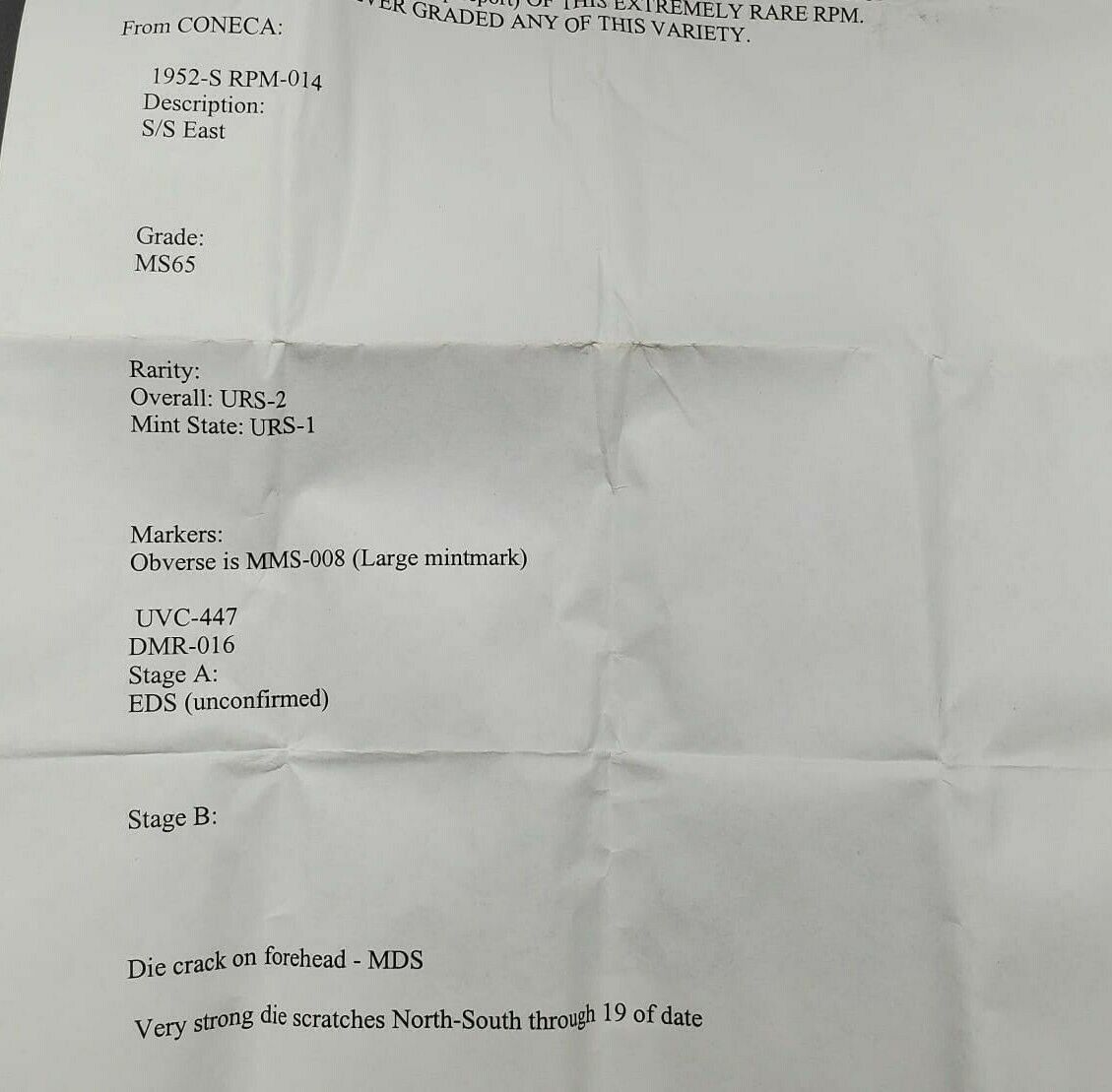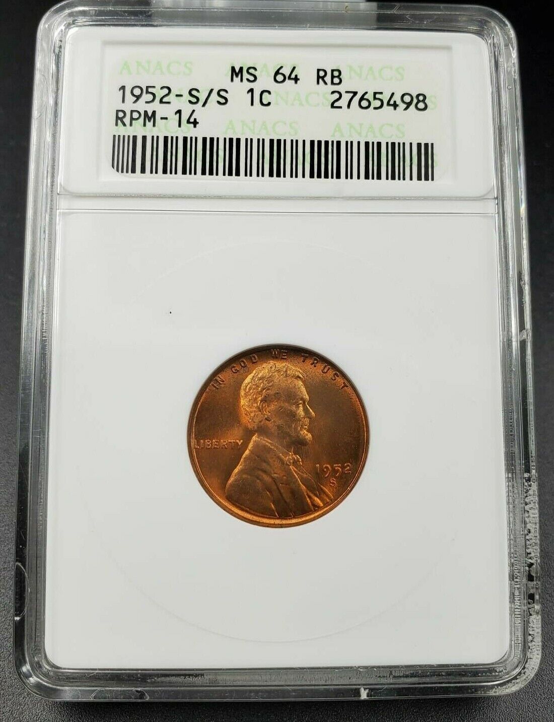 1952 S/S Lincoln Wheat Cent Penny ANACS MS64 RB RPM 014 Variety DMR-016