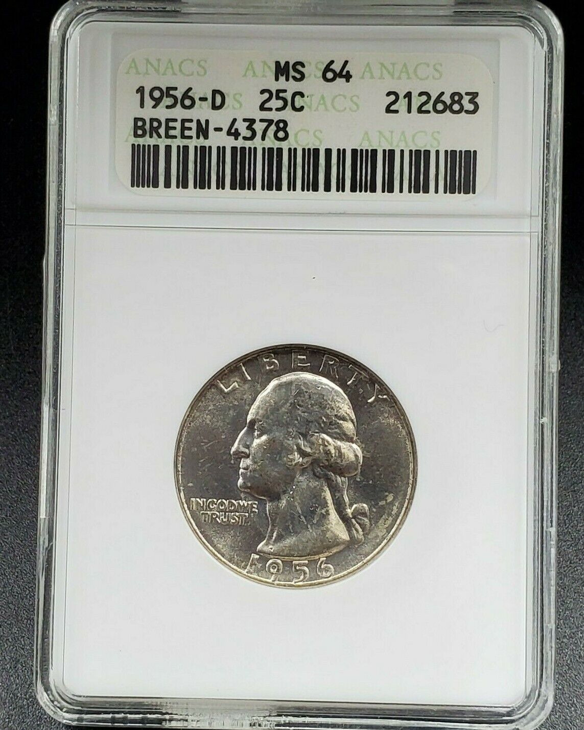1956 D D/D 25c Washington Quarter Variety MS63 ANACS Breen-4378 D/Horizontal D