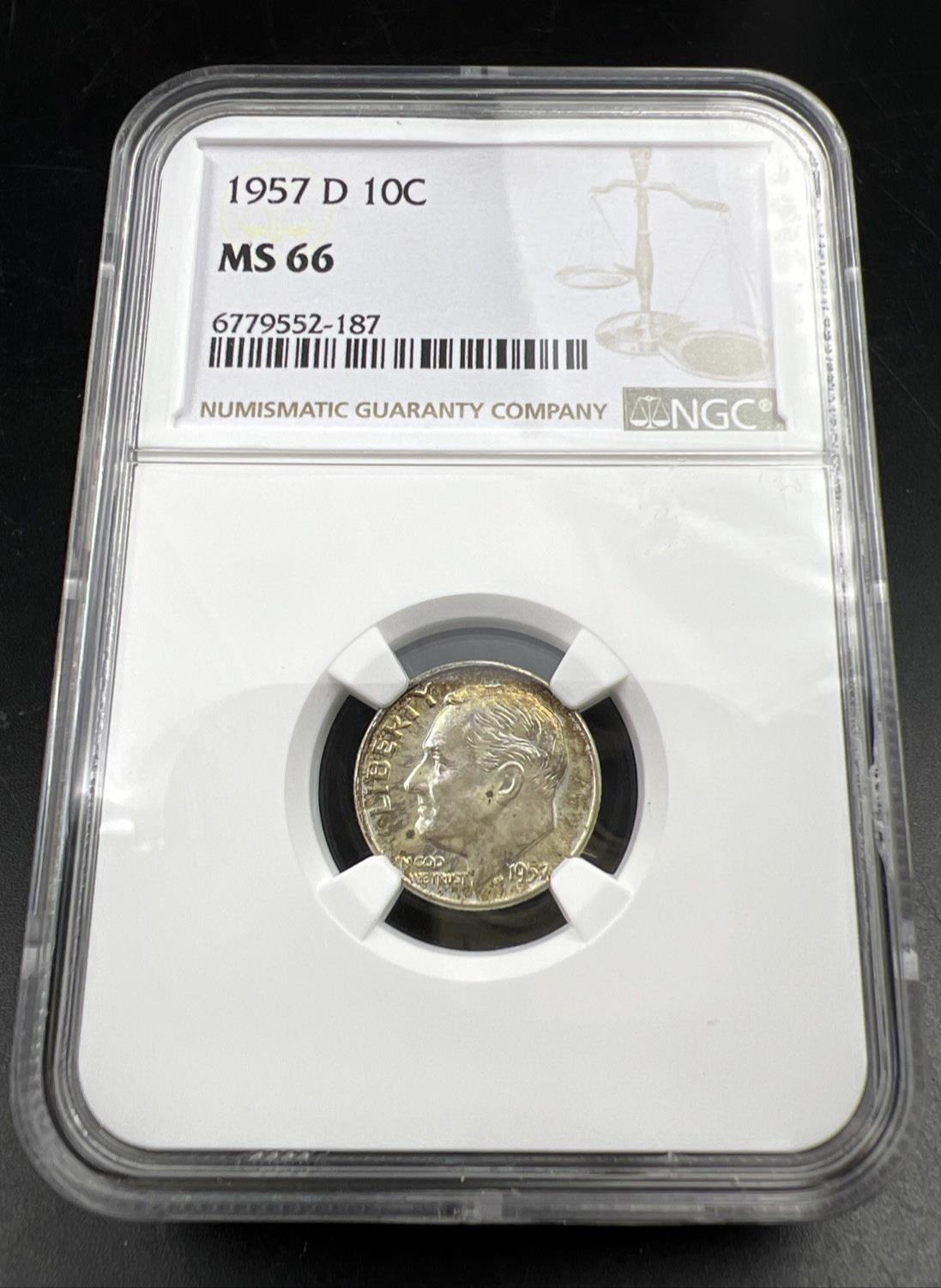 1957 D 10c Roosevelt Silver Dime Coin MS66 NGC Gem BU Certified #187 Neat Toning