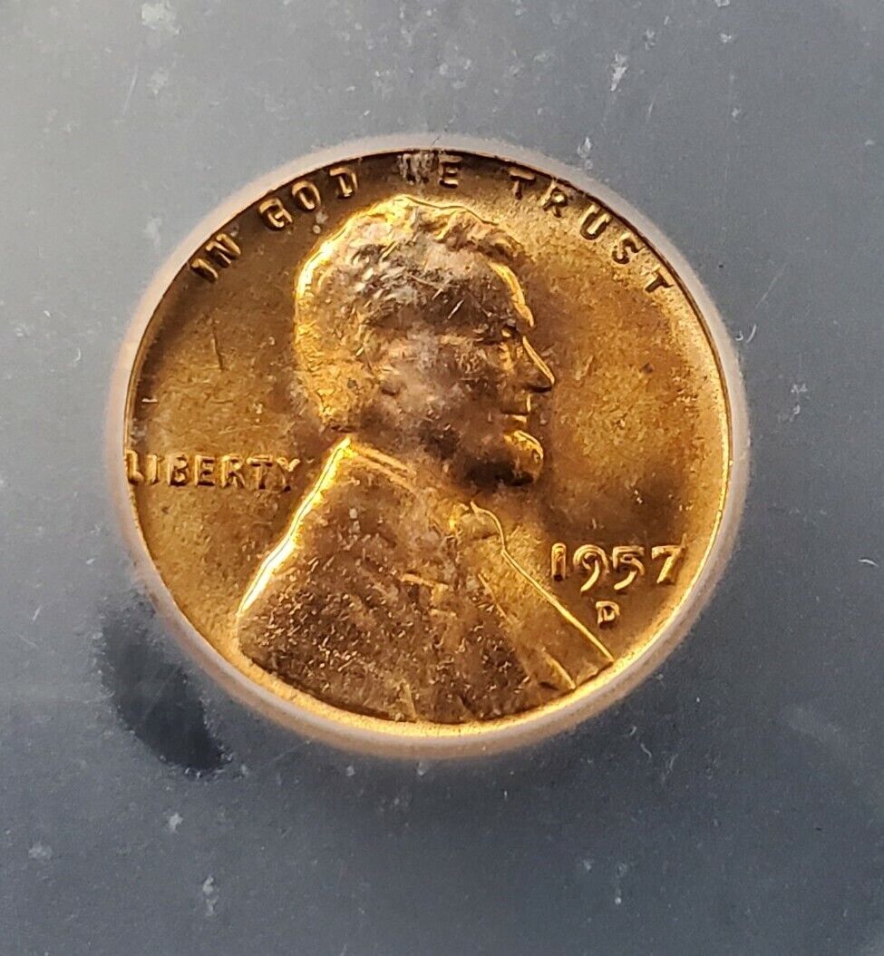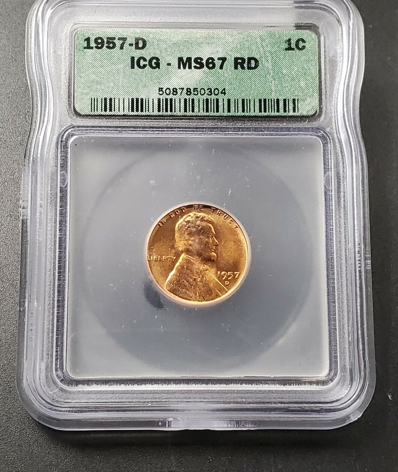 1957 D Lincoln Wheat Cent Penny Coin ICG MS67 RED RD Die Chips @ Date Variety