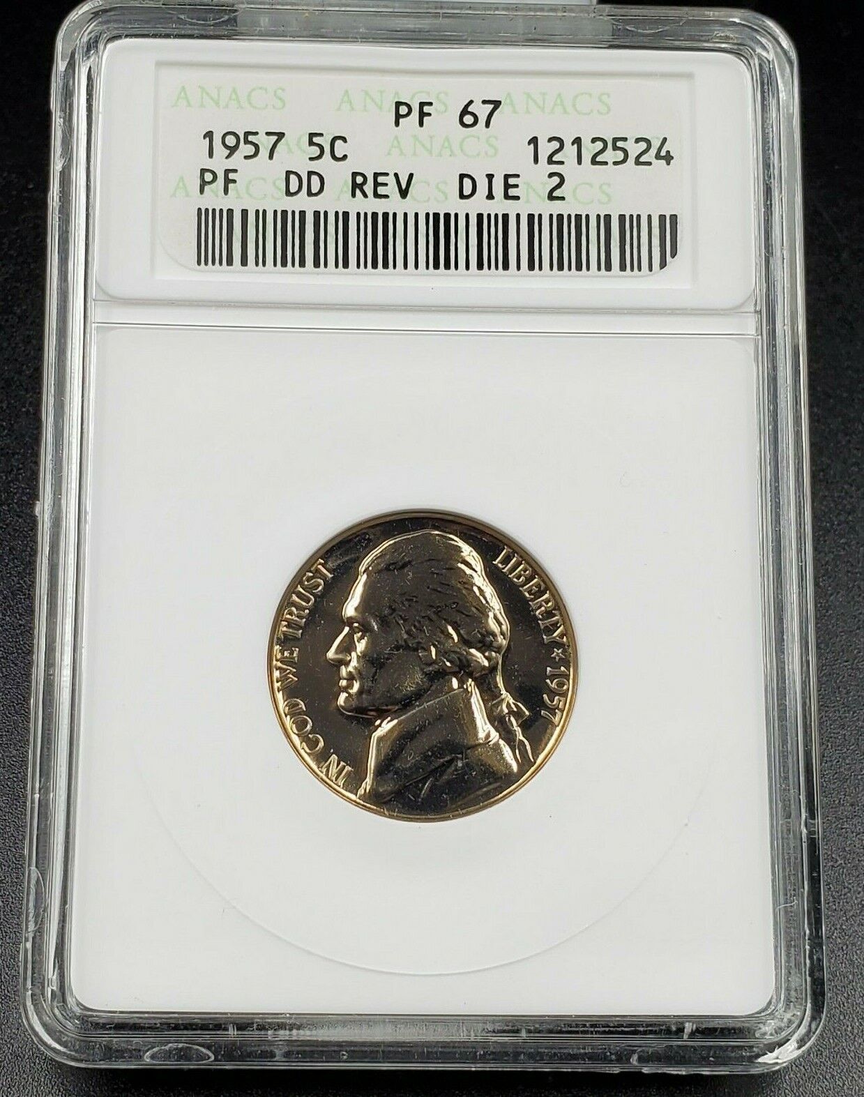 1957 Proof Jefferson Nickel ANACS PF67 DDR Double Die Reverse 002 DMR-006