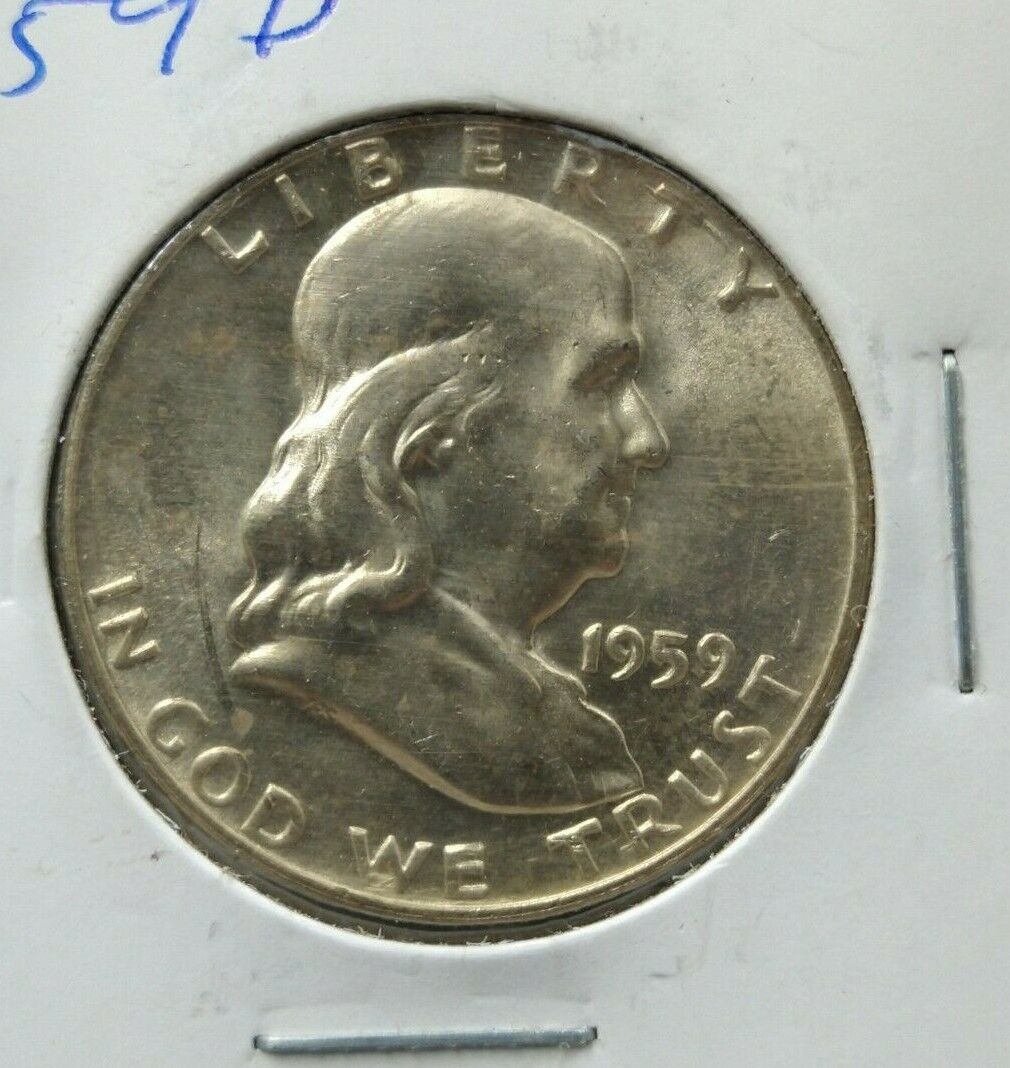 1959 D Franklin Silver 90% Half Dollar Coin CH BU UNC Die Chips Reverse Variety