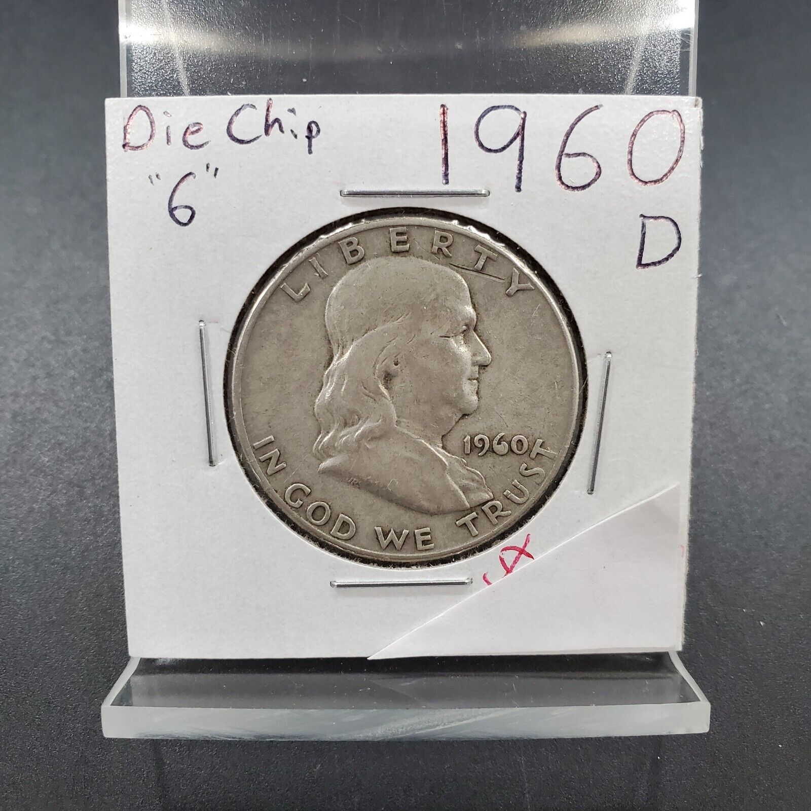 1960 D Franklin Silver Half Dollar Coin Circulated Die Chip in 6 of date Variety