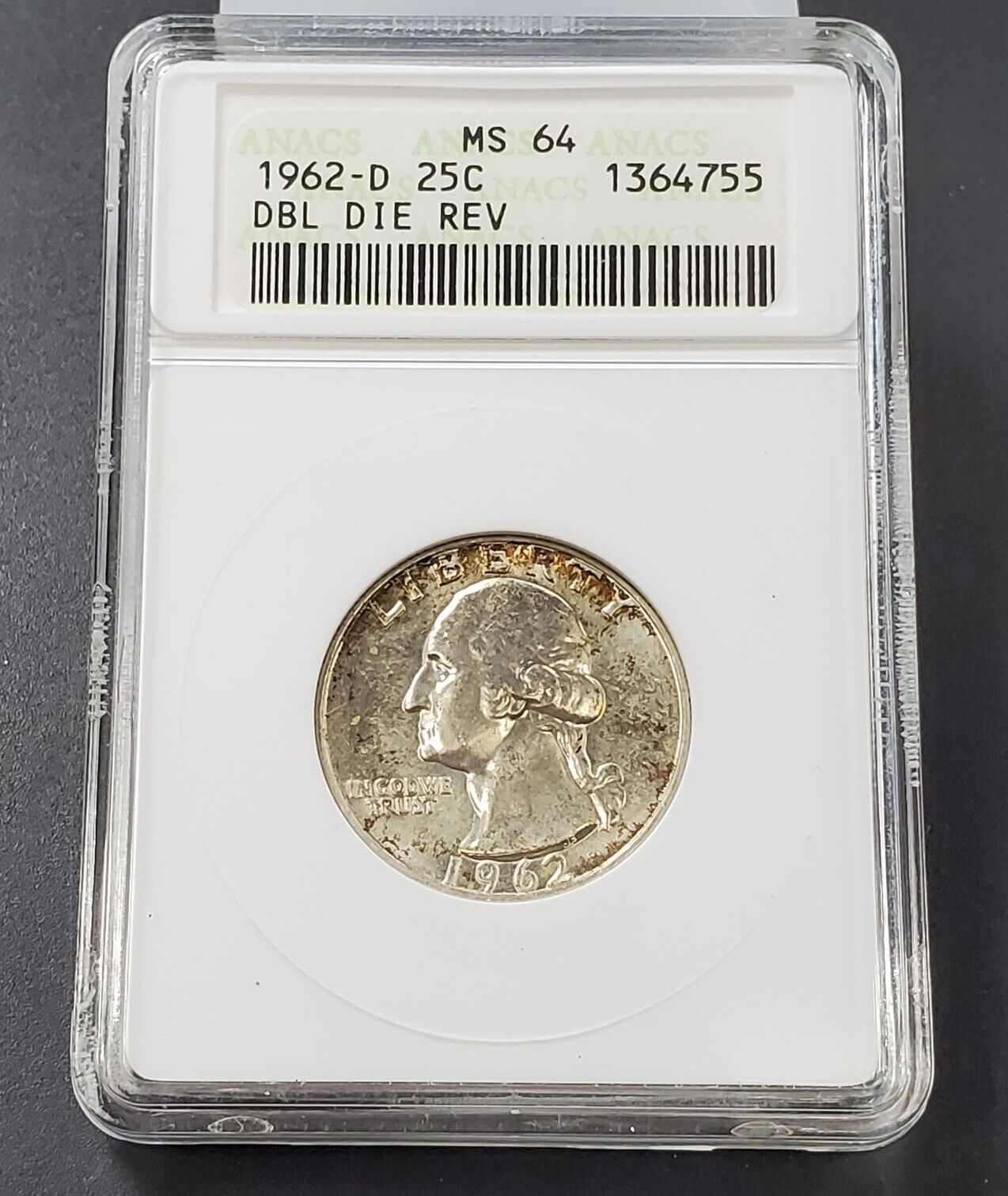 1962 D Washington Quarter 25c ANACS MS64 Double Die REV Variety Coin