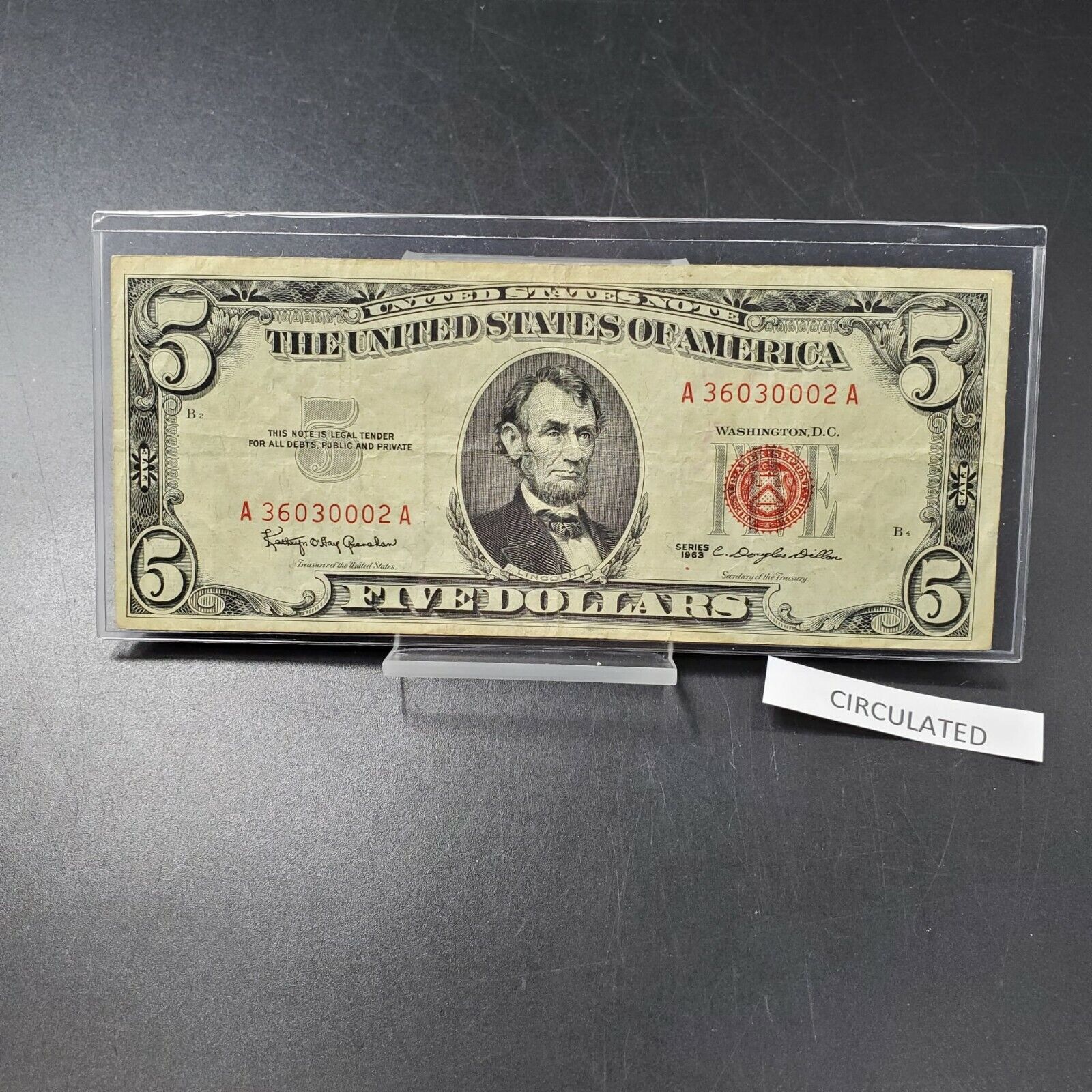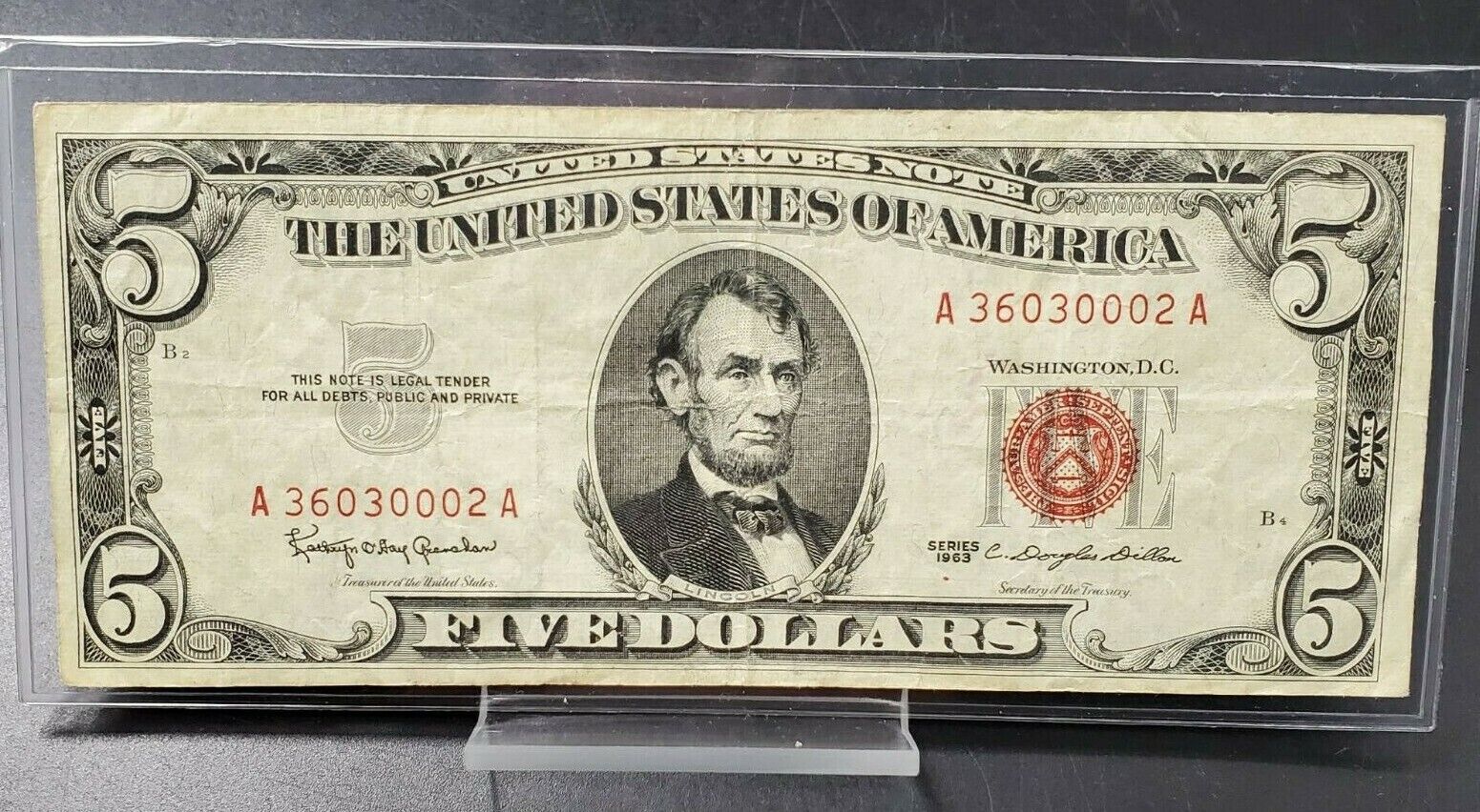1963 $5 Red Seal Legal Tender Note Bill VF Very Fine US Currency Repeat serial #