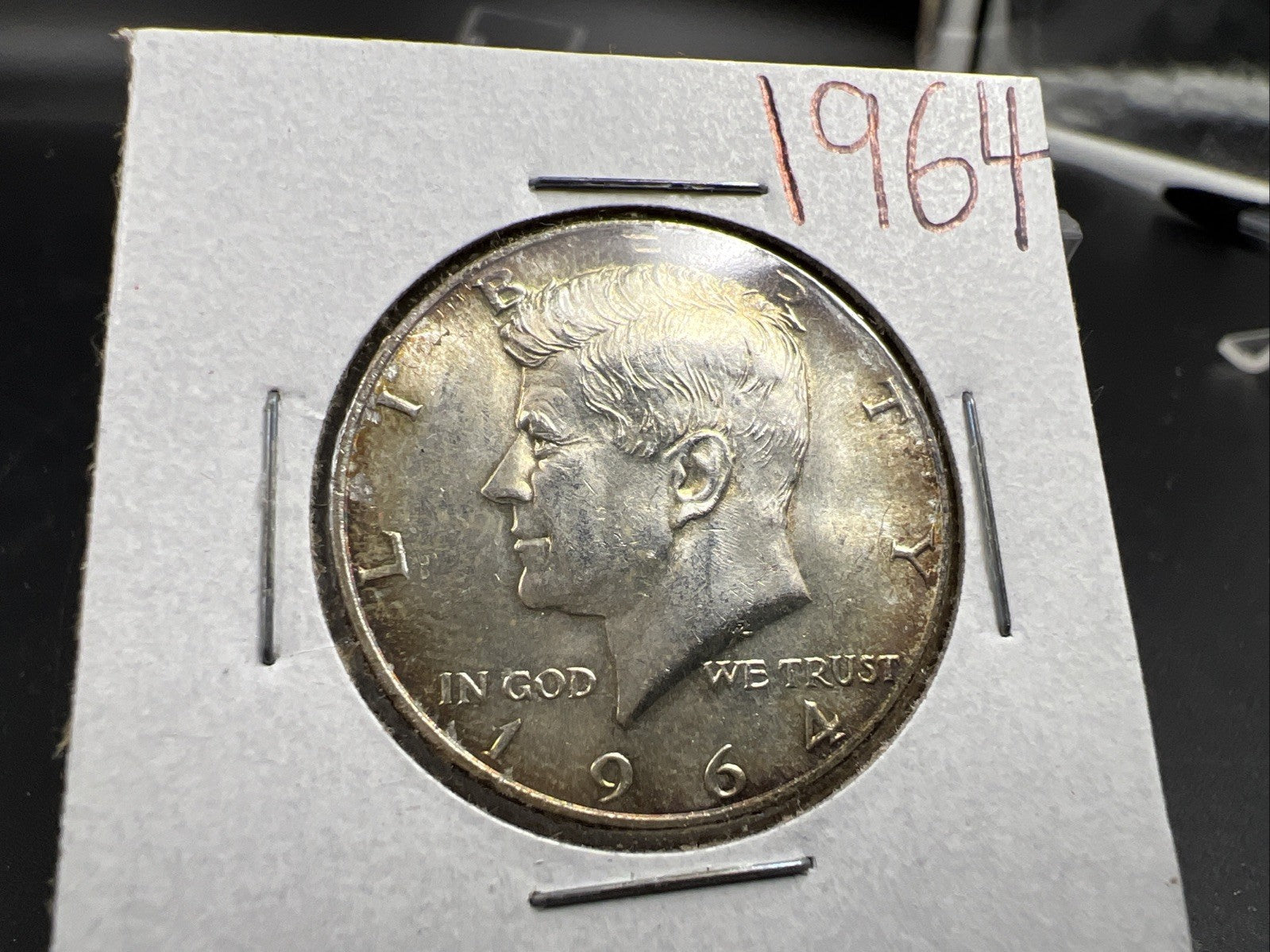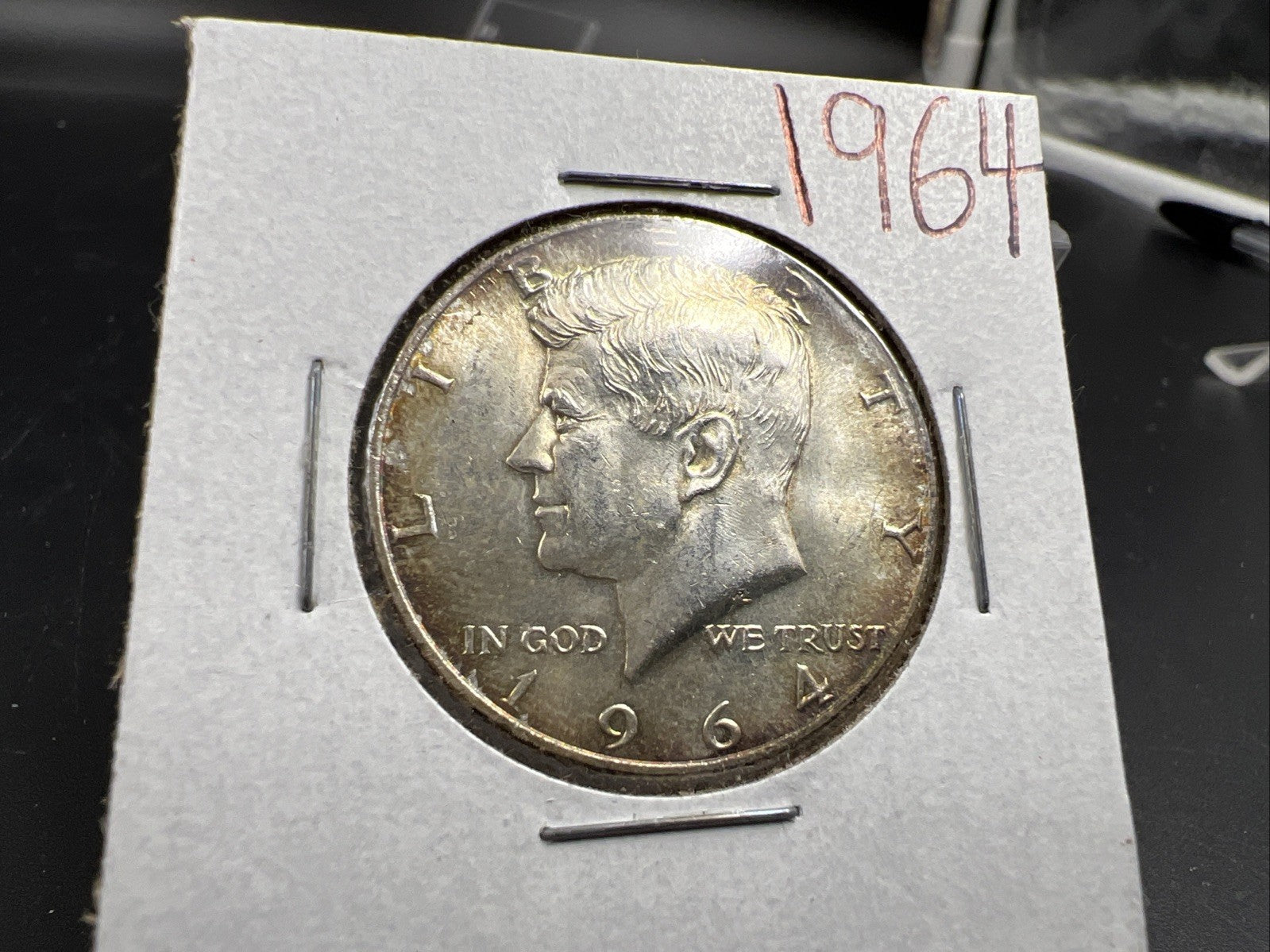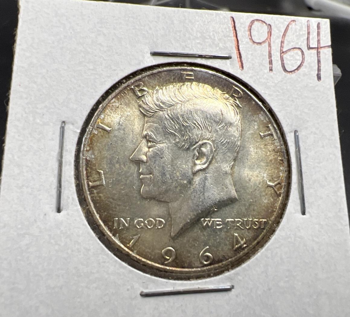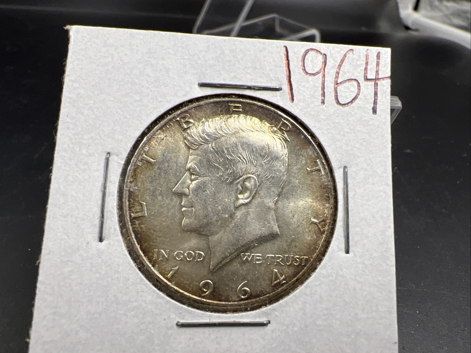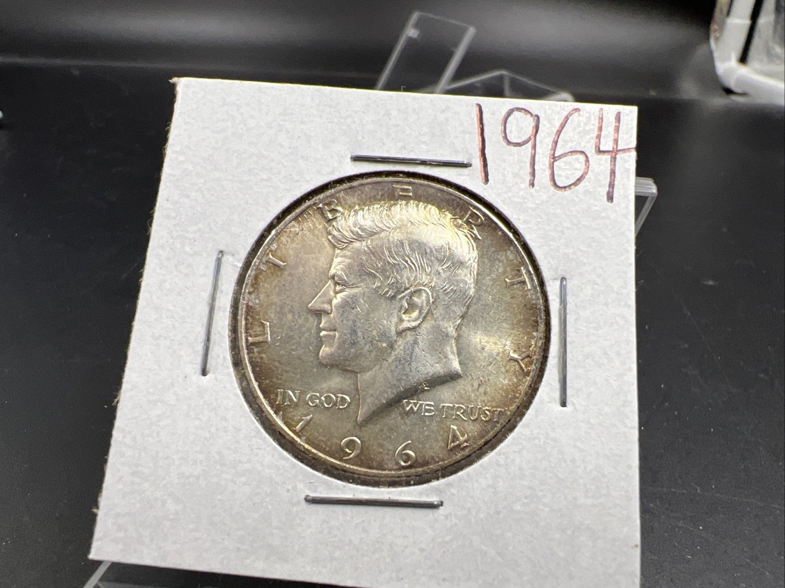 1964 P 50c Kennedy Silver Half Dollar Coin Choice AU / UNC Amber Toning #A