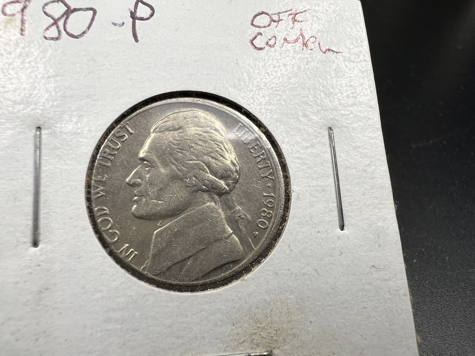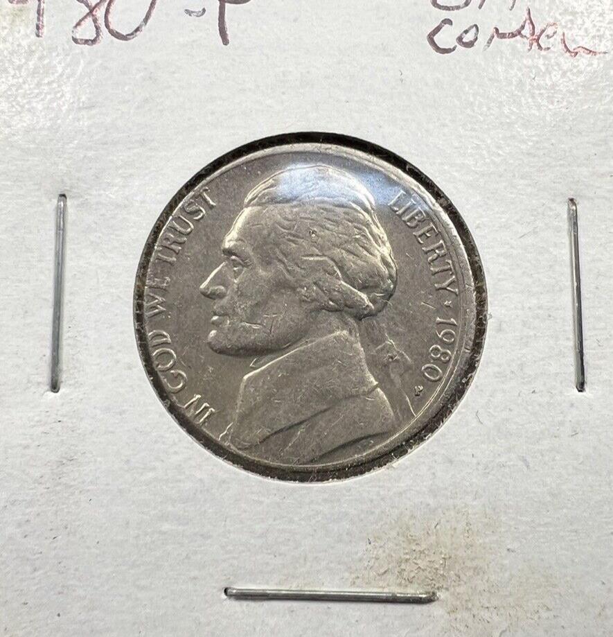 1980 P Jefferson Nickel 5c Coin SLIGHT Misaligned Obverse Die Error VF Circ