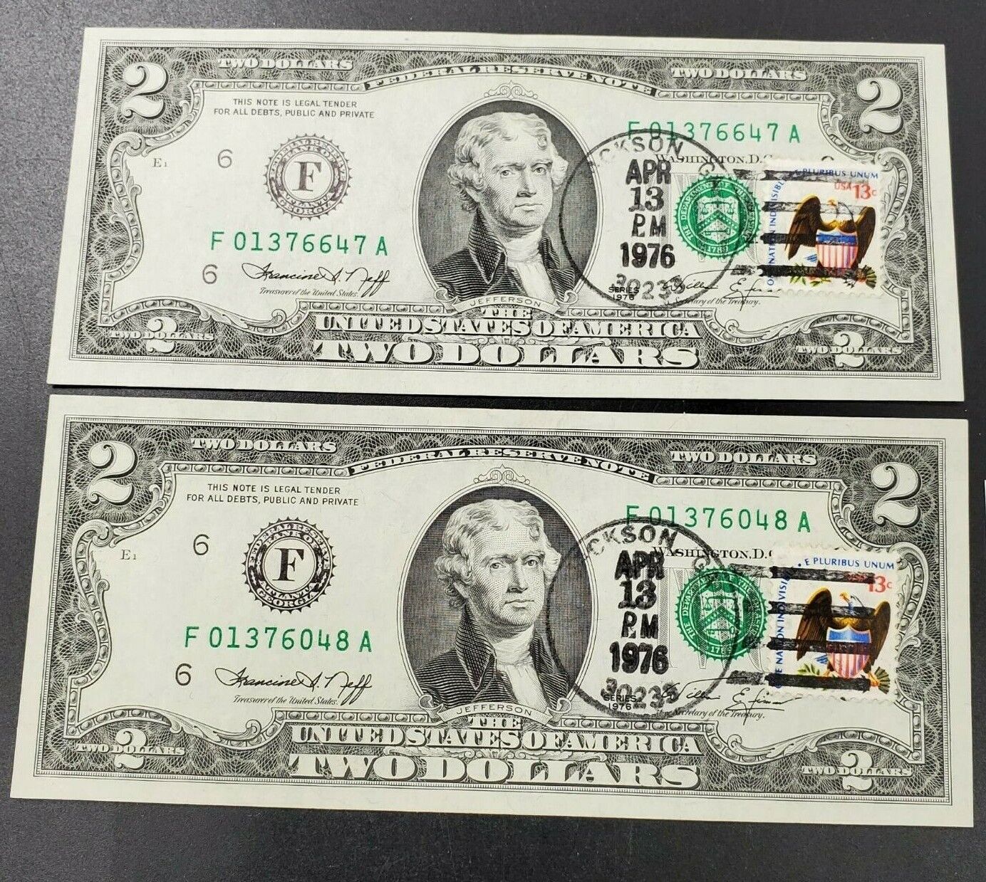 2 CONSECUTIVE Postal 1976 $2 FRN Jackson GA Branch CH UNC BICENTENNIAL