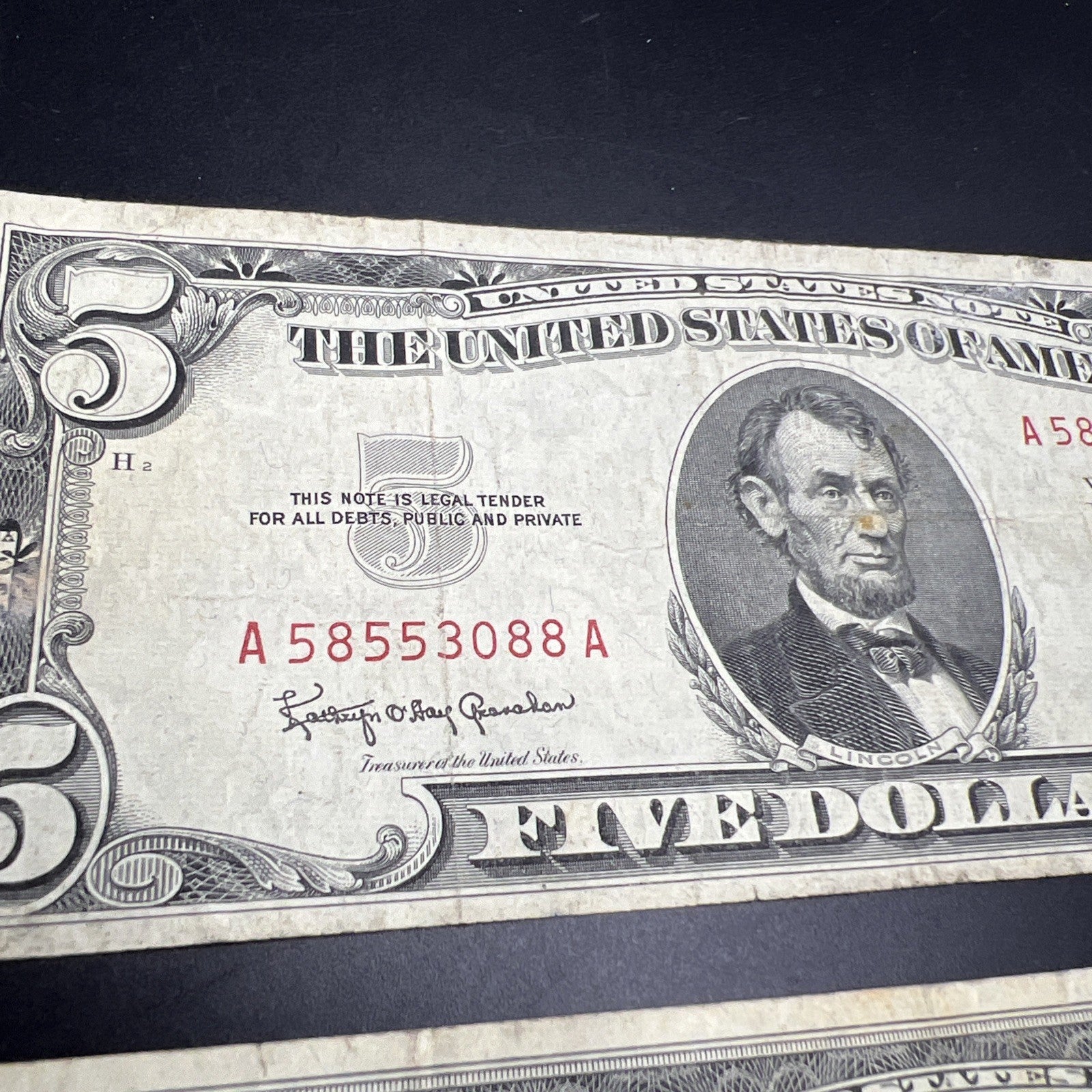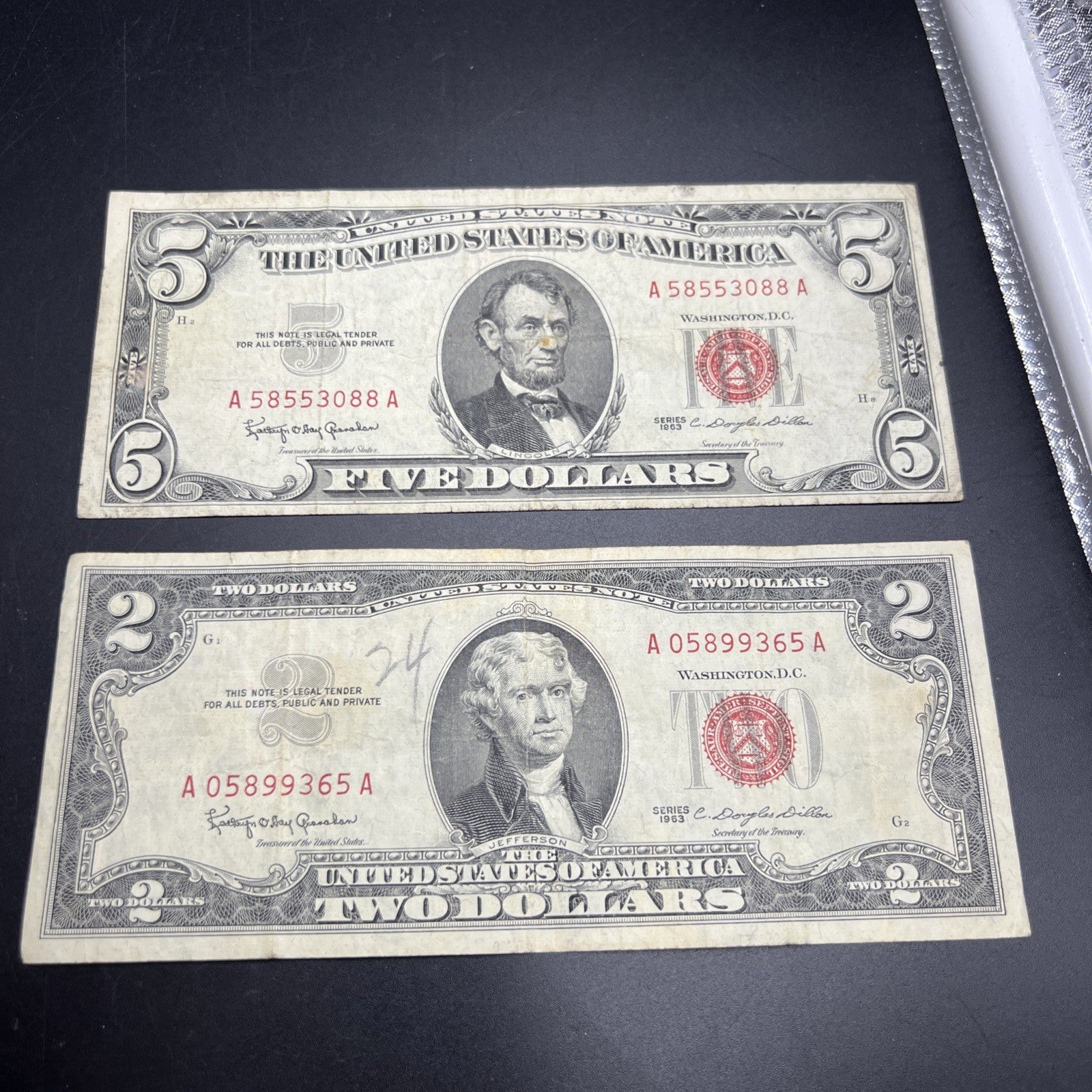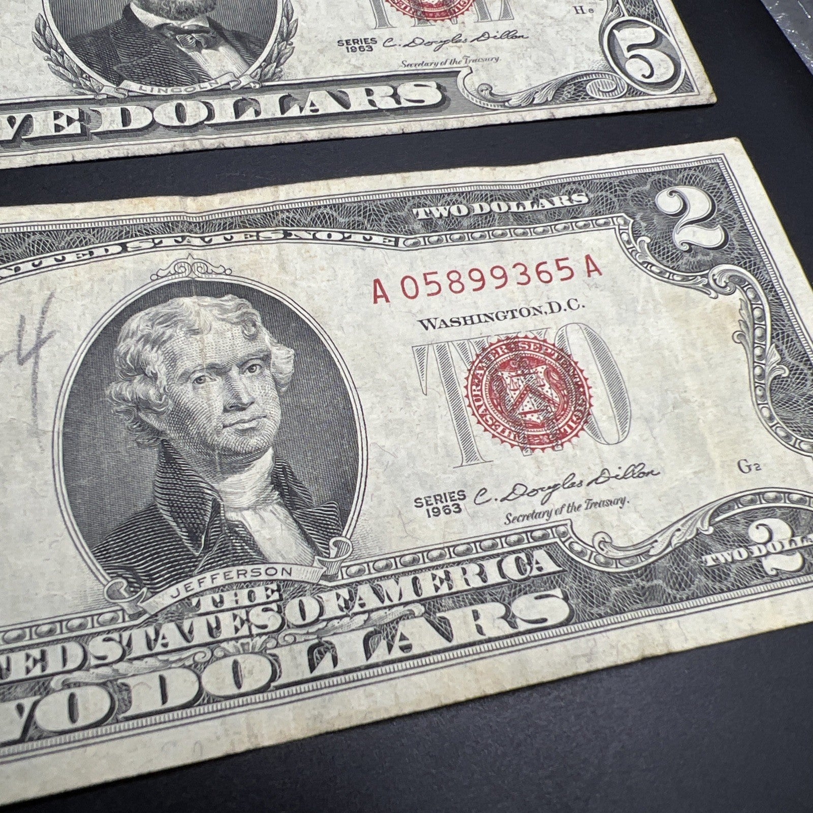 2 Note United States Legal Tender Red Seal Set 1963 $2 & $5 Bills VG Very Good #