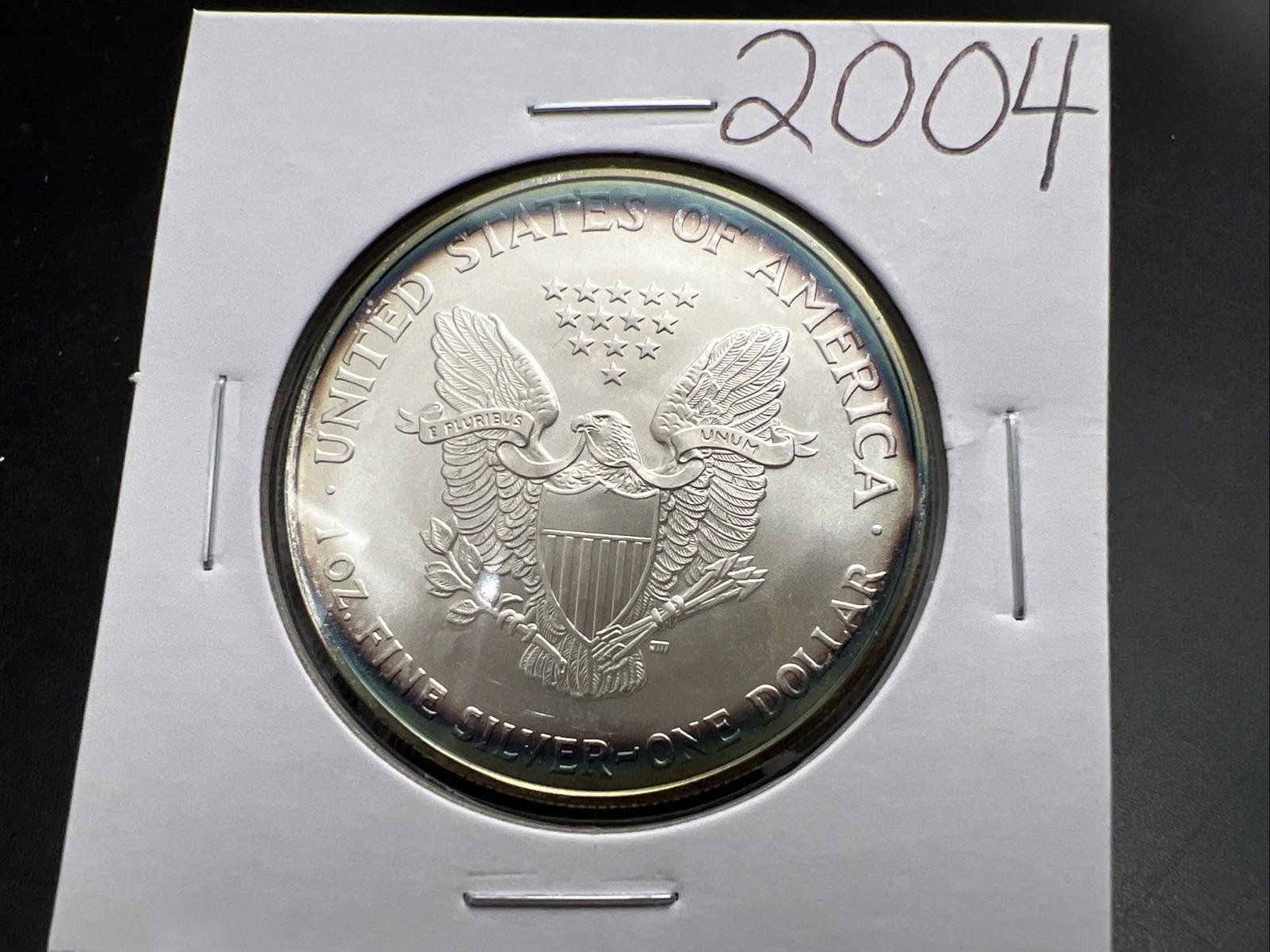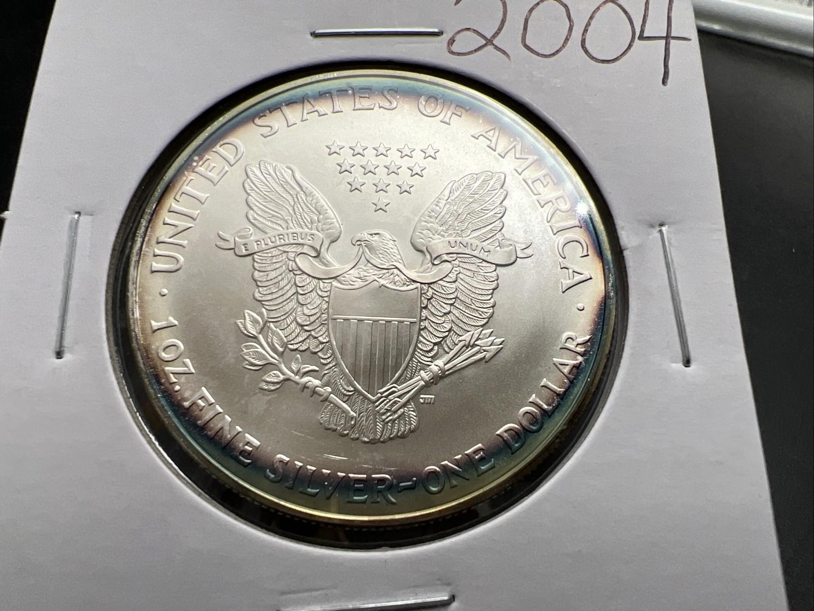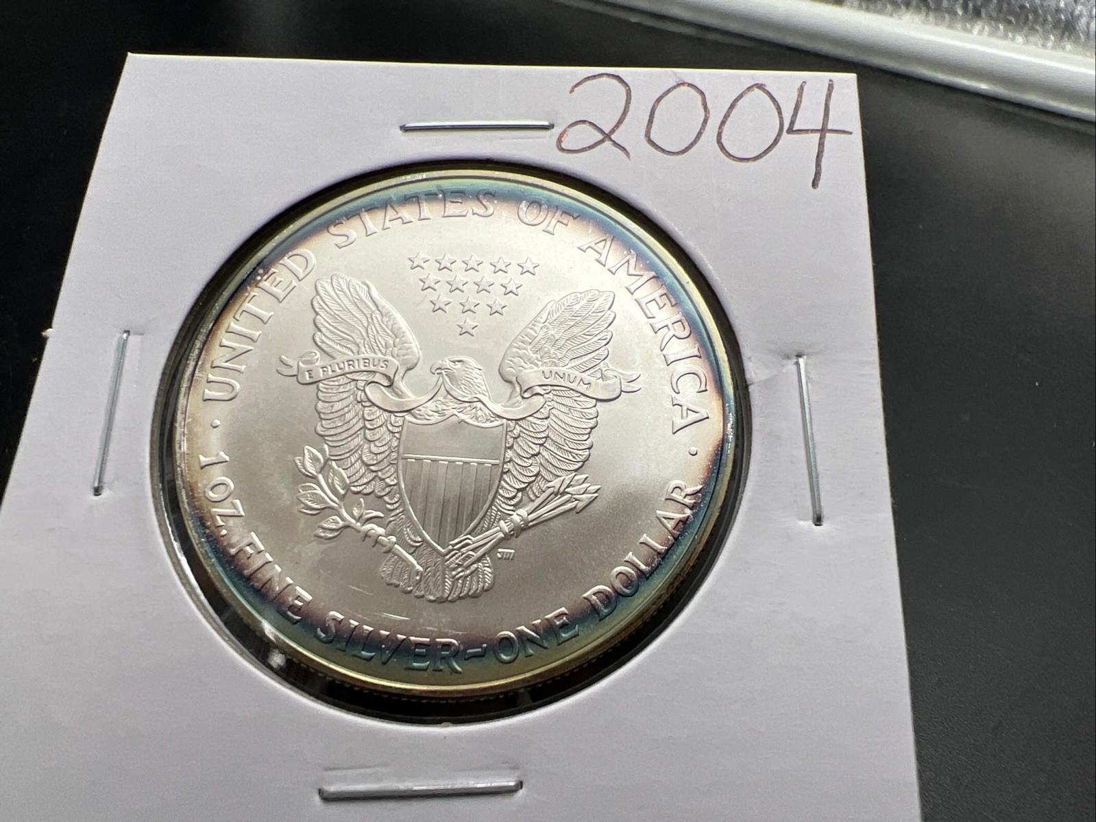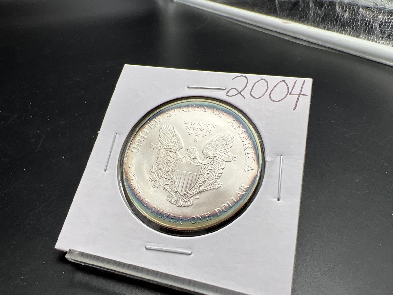 2004 1 OZ American Silver Eagle GEM BU Unc .999 Nice Toning Toner Nearly Halo