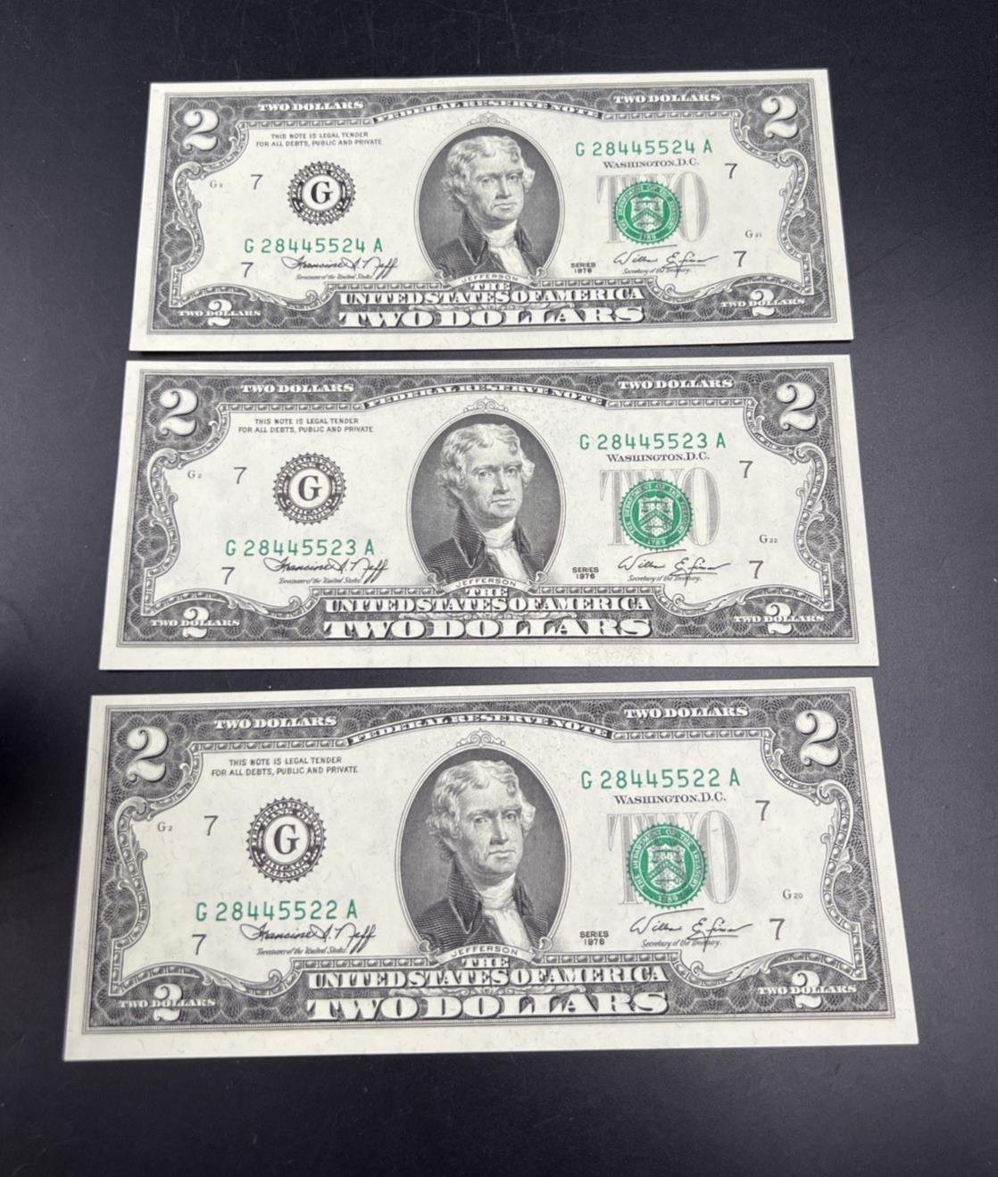 3 Consecutive 1976 $2 FRN Federal Reserve Notes Repeat Serial Numbers #22
