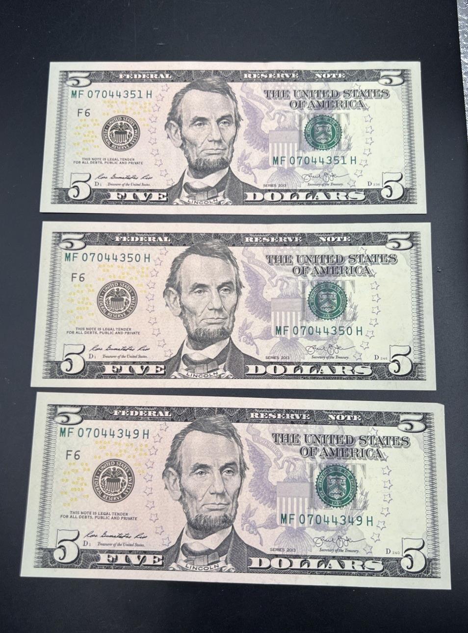 3 Consecutive 2013 $5 FRN Federal Reserve Notes Choice UNC #349