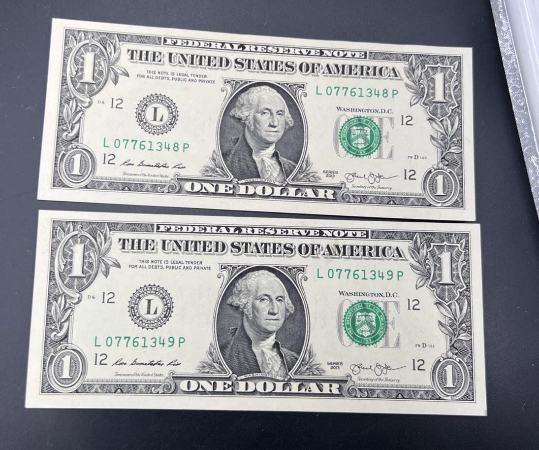 Consecutive Pair 2013 $1 FRN Federal Reserve Note Bills CH UNC #349