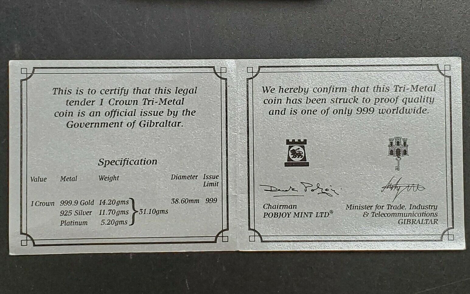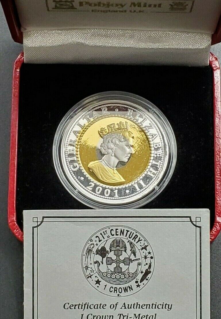 Gibraltar 2001 1 Crown 21st Century Tri-Metal Gold Silver Platinum 1 Oz Coin OGP