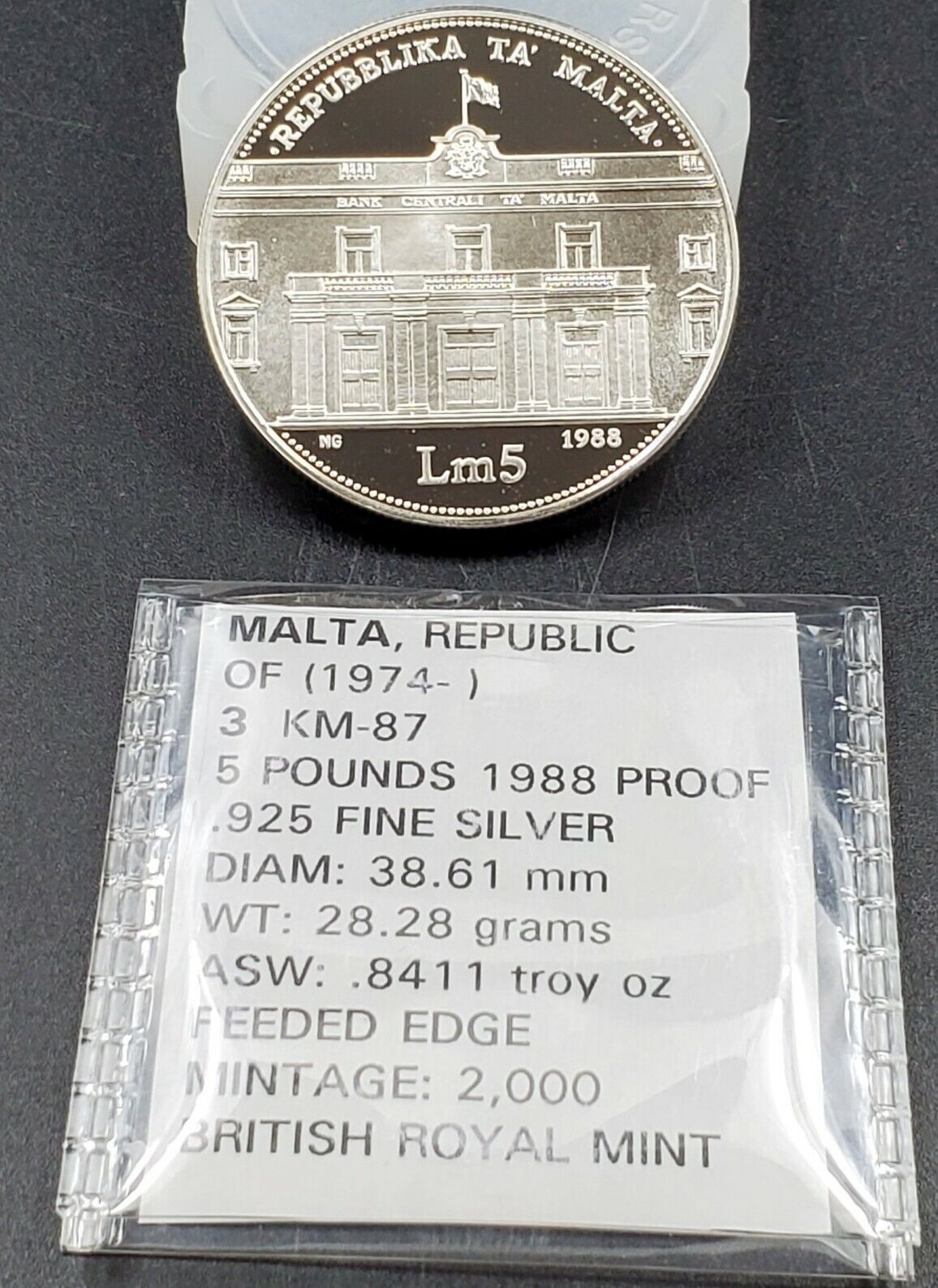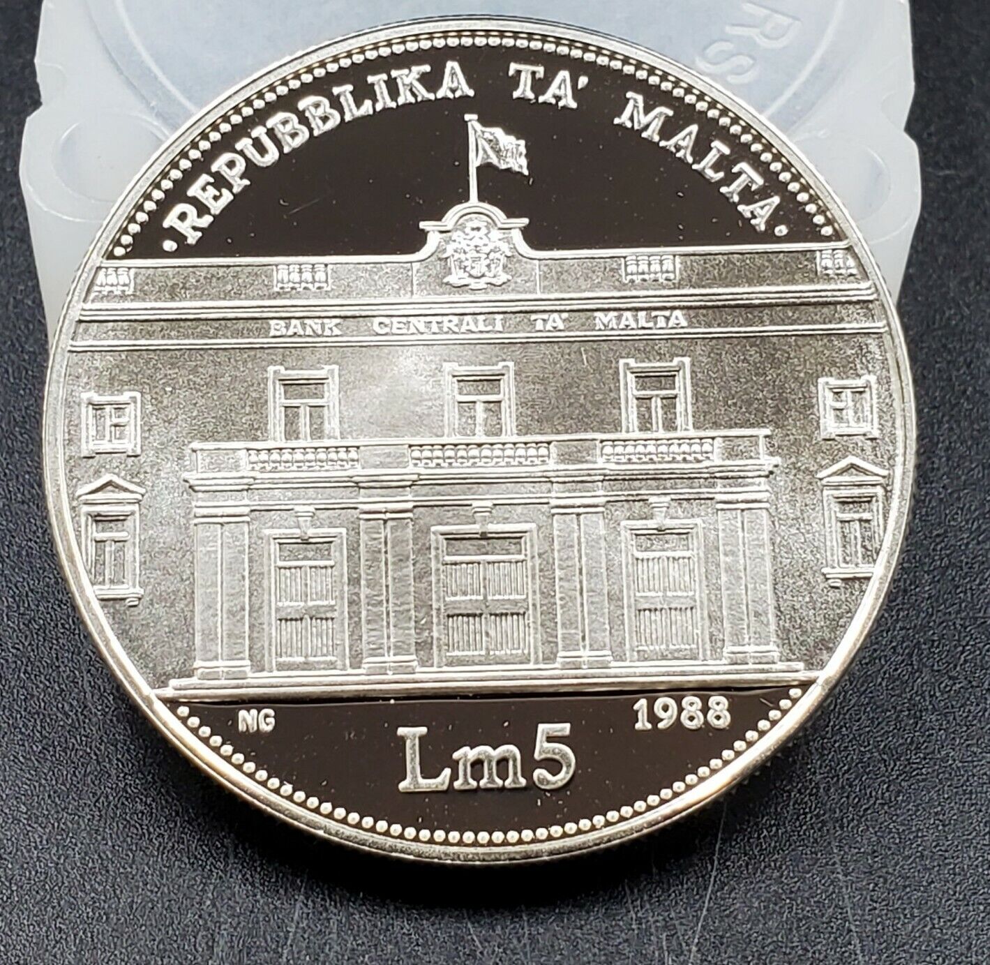 Malta 1988 Silver Coin Proof Lm5 20th Anniversary Central Bank PIEDFORD 2K MINTAGE